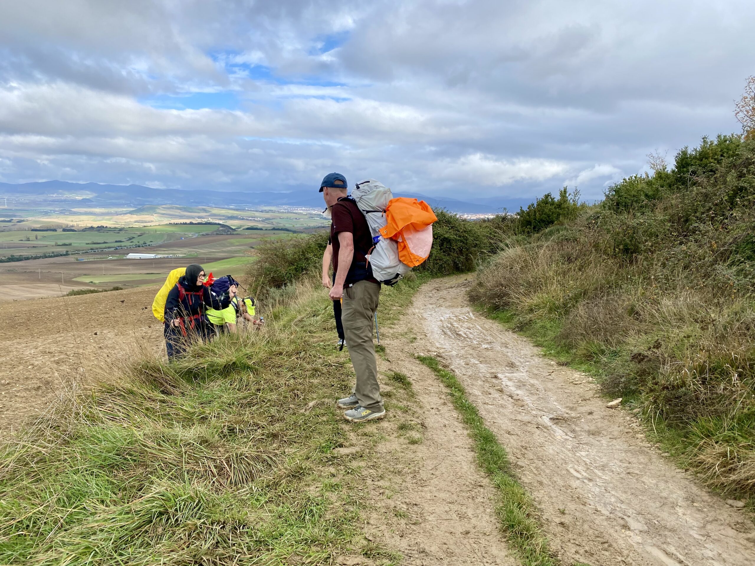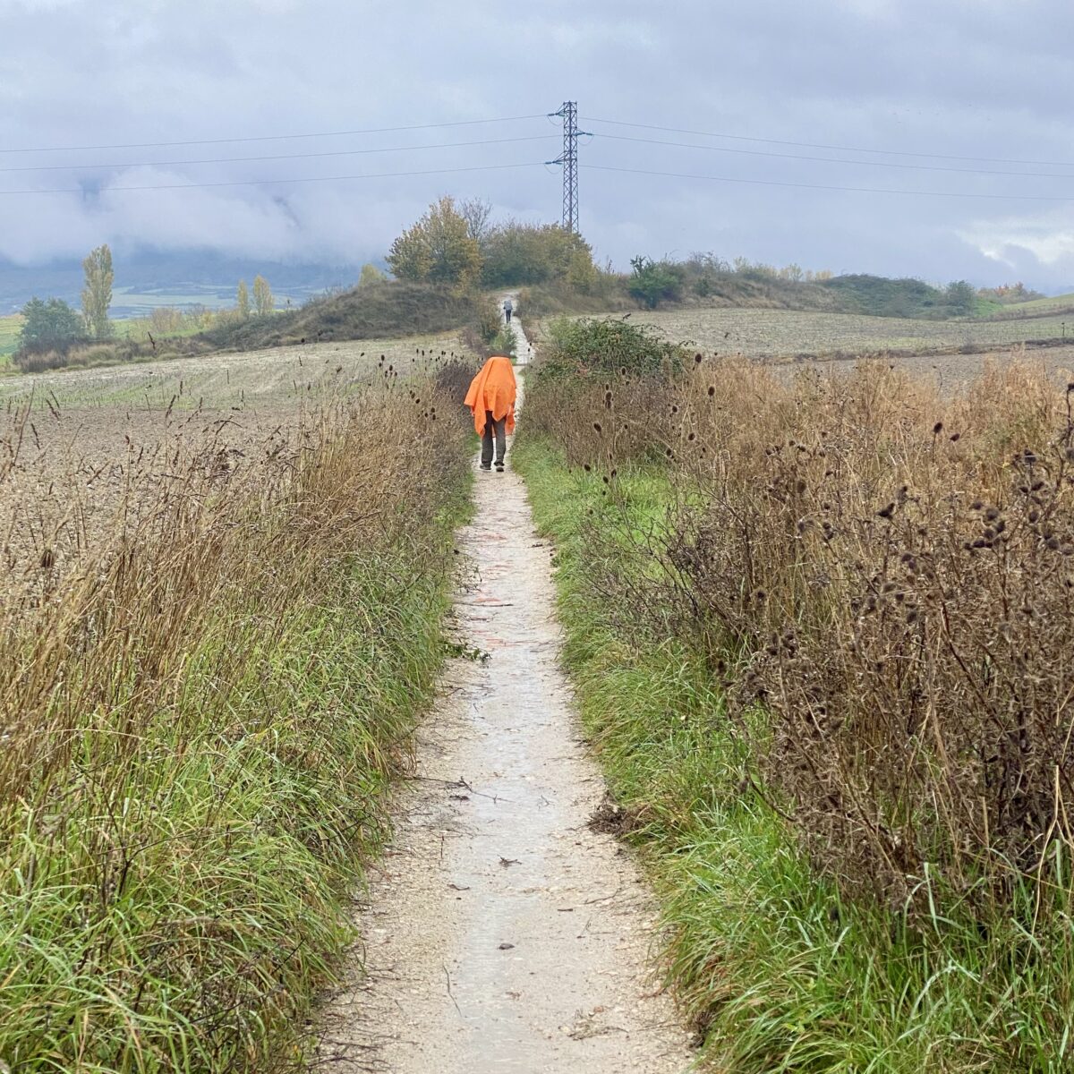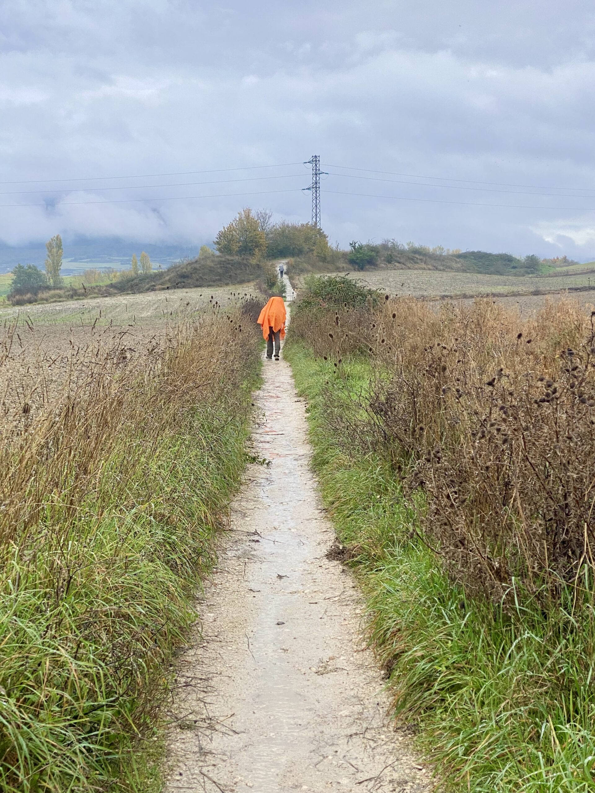Today we had rain. But it was a lot like Oregon rain, so tolerable. Time to test out the ponchos! We wandered from the center of Pamplona to the outskirts, then wove our way through huge expanses of farmland, all the while dodging endless puddles and sticky mud. Behind us we could hear our Italian friends chatting up a storm. All of them traveled here individually and have now formed a group of 5. Then they picked up another solo Italian traveler along the way: Julia from Rome.