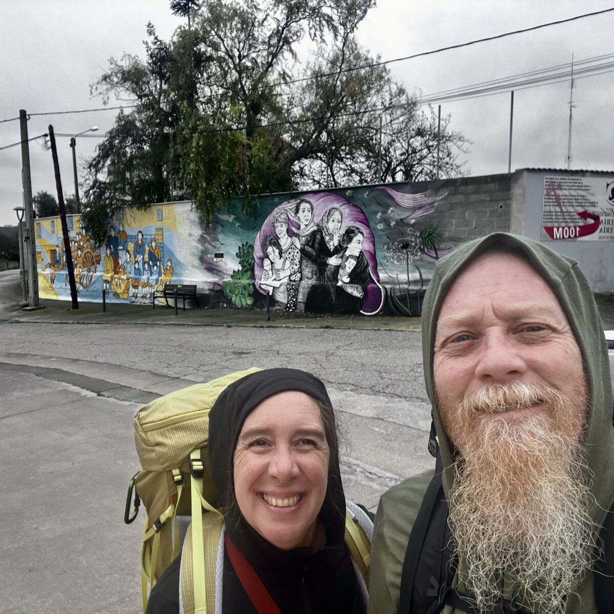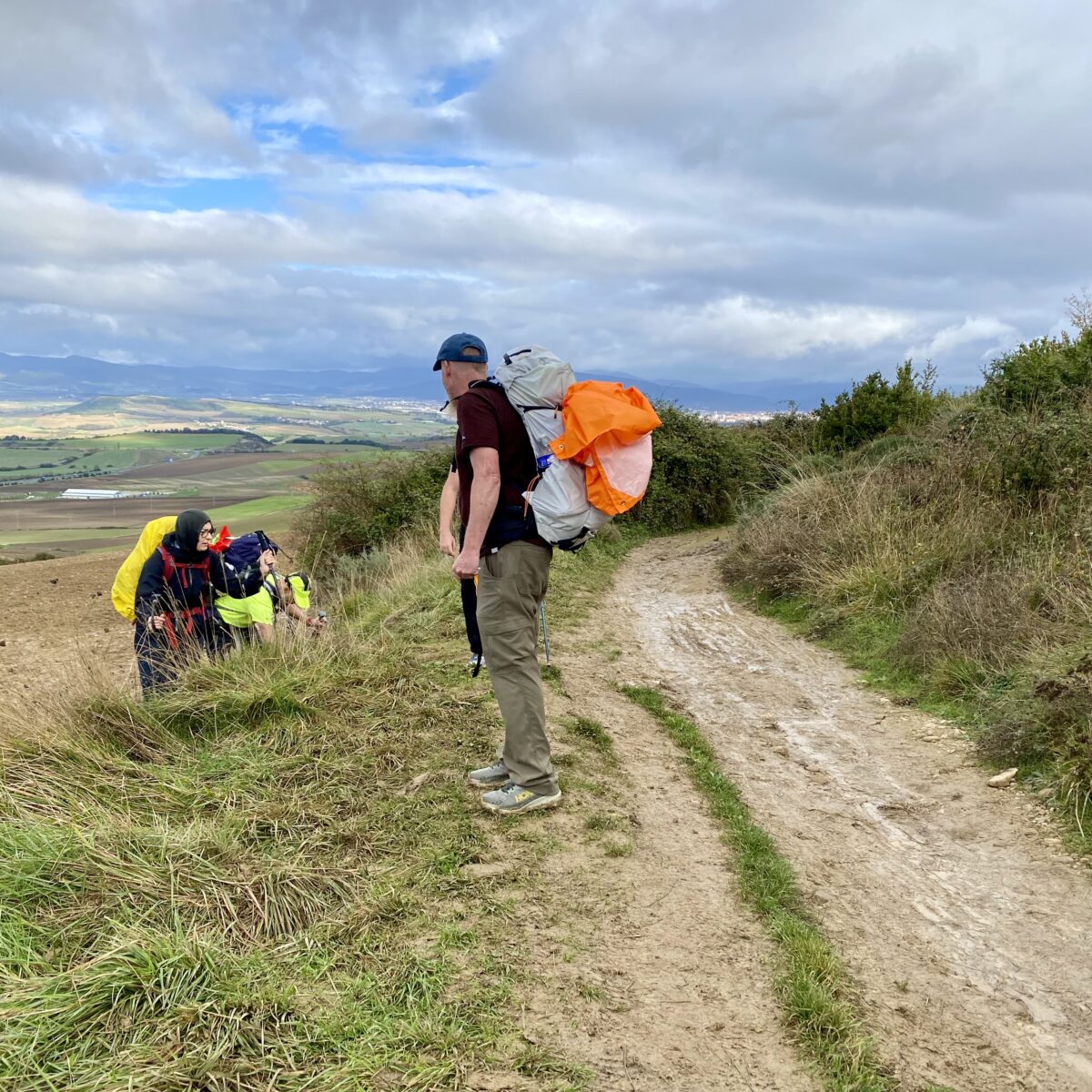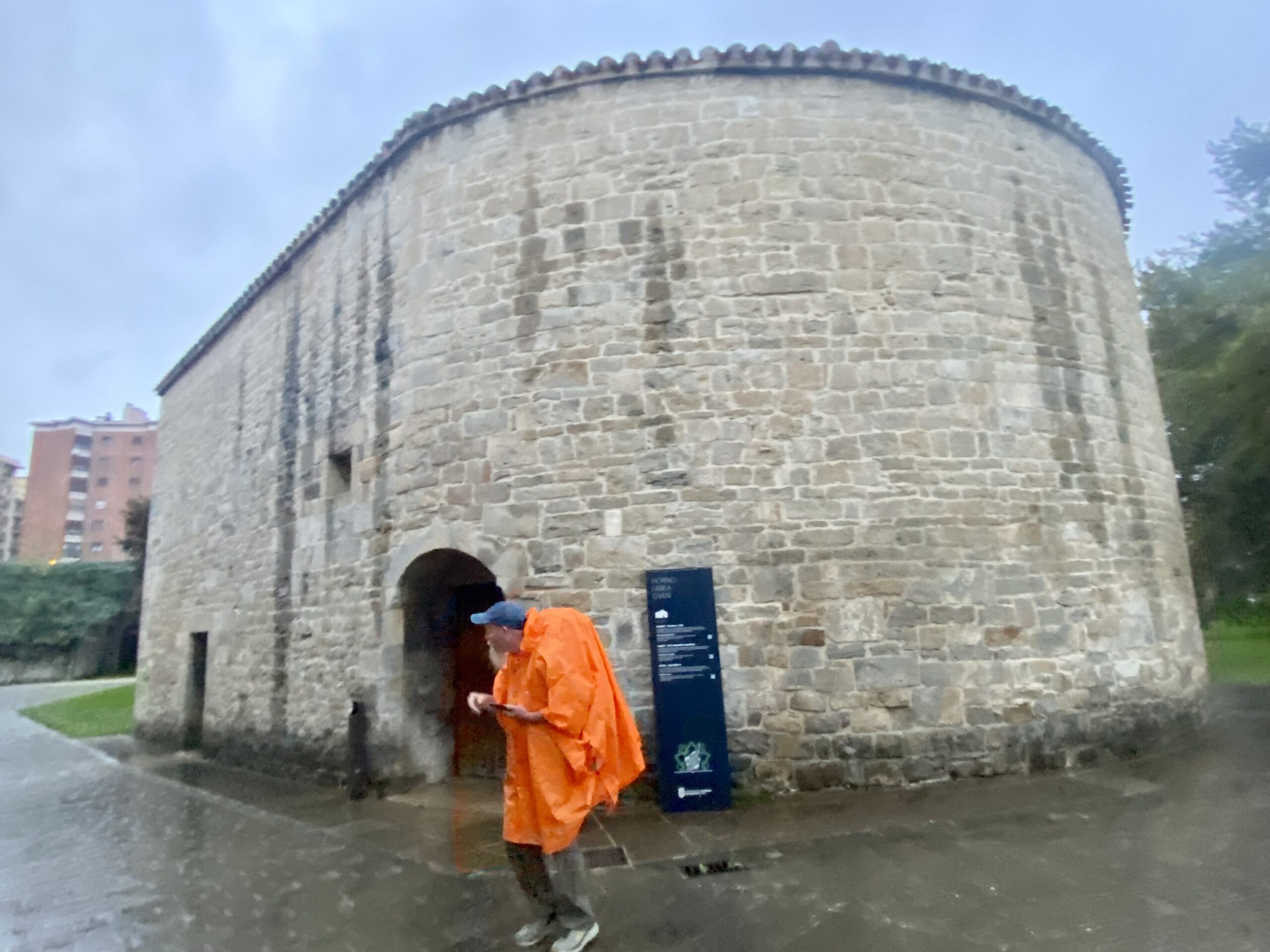 Today we had rain. But it was a lot like Oregon rain, so tolerable. Time to test out the ponchos! We wandered from the center of Pamplona to the outskirts, then wove our way through huge expanses of farmland, all the while dodging endless puddles and sticky mud. Behind us we could hear our Italian friends chatting up a storm. All of them traveled here individually and have now formed a group of 5. Then they picked up another solo Italian traveler along the way: Julia from Rome.