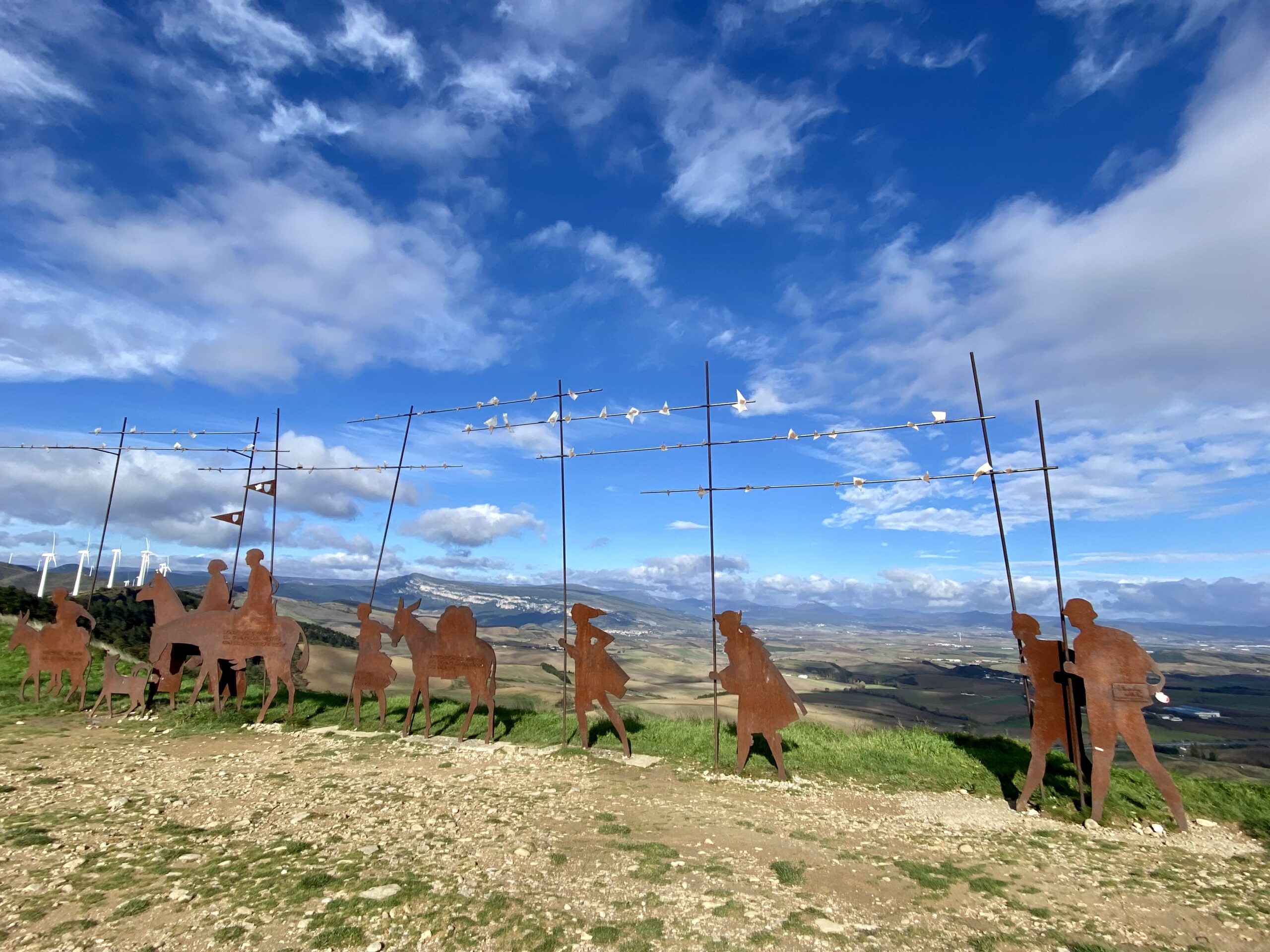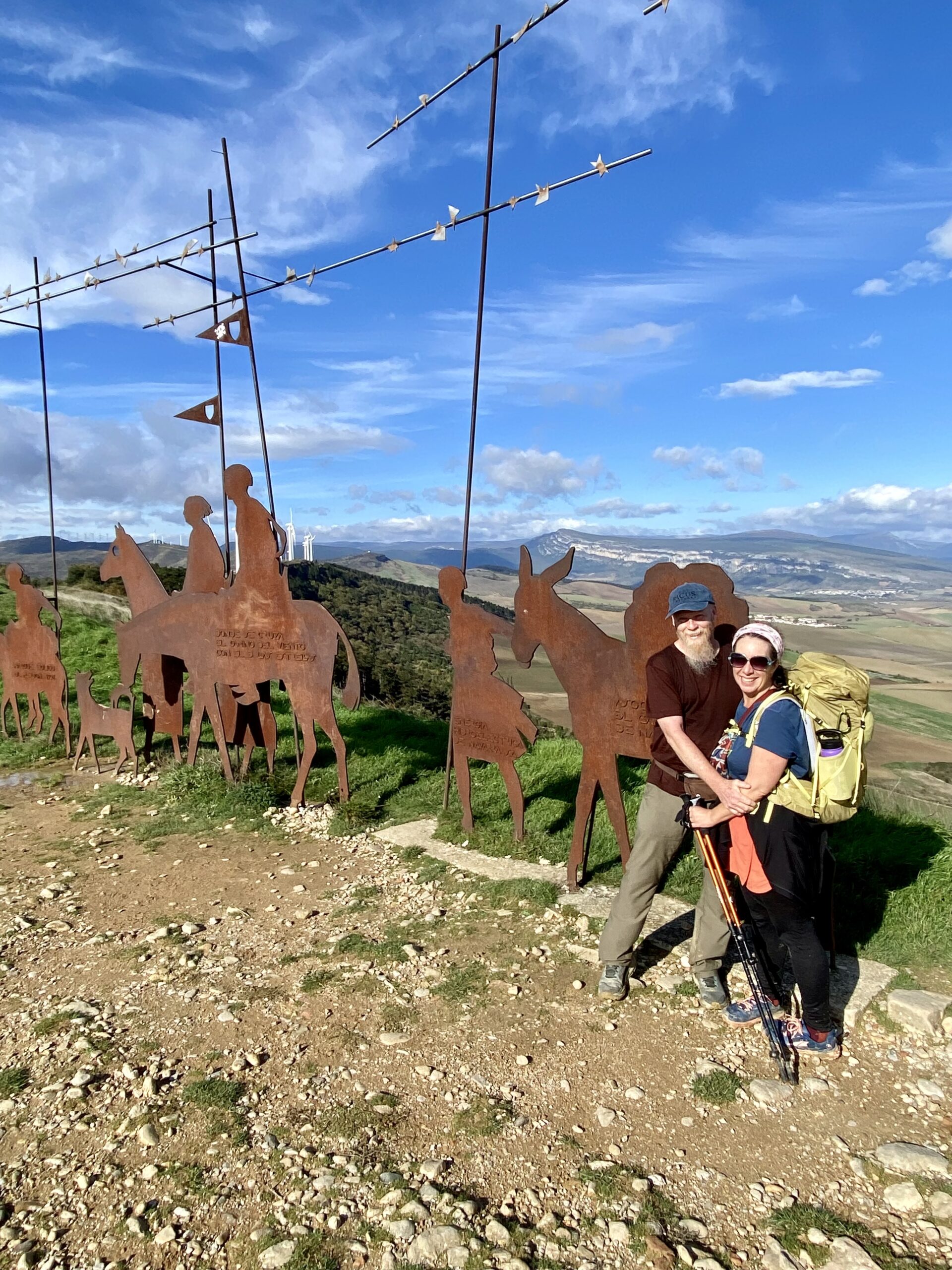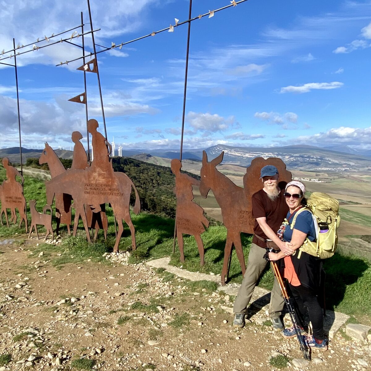 Finally we made it to the top. Here was the famous pilgrim silhouette sculpture with a stunning backdrop, an aerial view of the farmland and the mountain we just climbed with the city of Pamplona in the distance. As we started to gather the crew together for a group photo, pilgrim after pilgrim started arriving up the hill. We cheered each one as they reached the top. Many of them were people we’ve been walking with since the start. It was an amazing moment of community celebration and camaraderie.