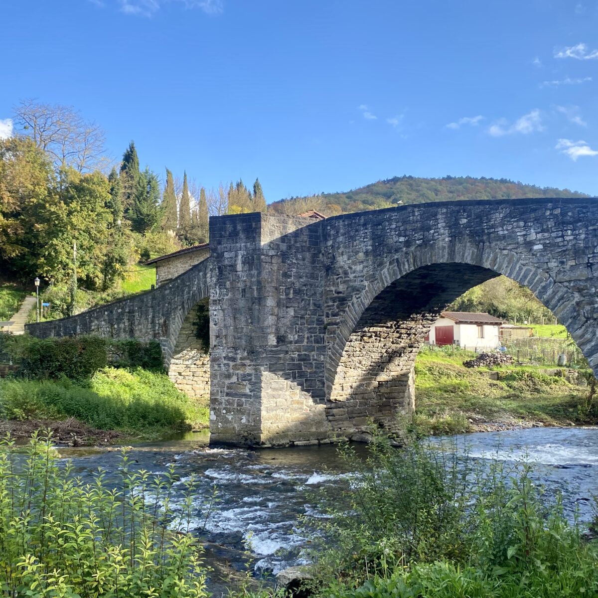 When you spend so much time walking, you also have a lot of time for thinking. We have sworn to not think (or talk) about politics. So today I pondered what it must have been like to travel this route during medieval times. Pilgrims were prey to so many dangers, robbers and thieves, unlike today where it is relatively safe. We have met so many women traveling solo on the trail. I doubt this would have been safe 1000 years ago. Walking through the forest, I listen for the voices of past pilgrims. I hear them in the wind, the rush of the river, and the chirps of the songbirds. Ancient sounds. Meanwhile, I felt increased energy as I walk in the footsteps of people who passed this way centuries ago.