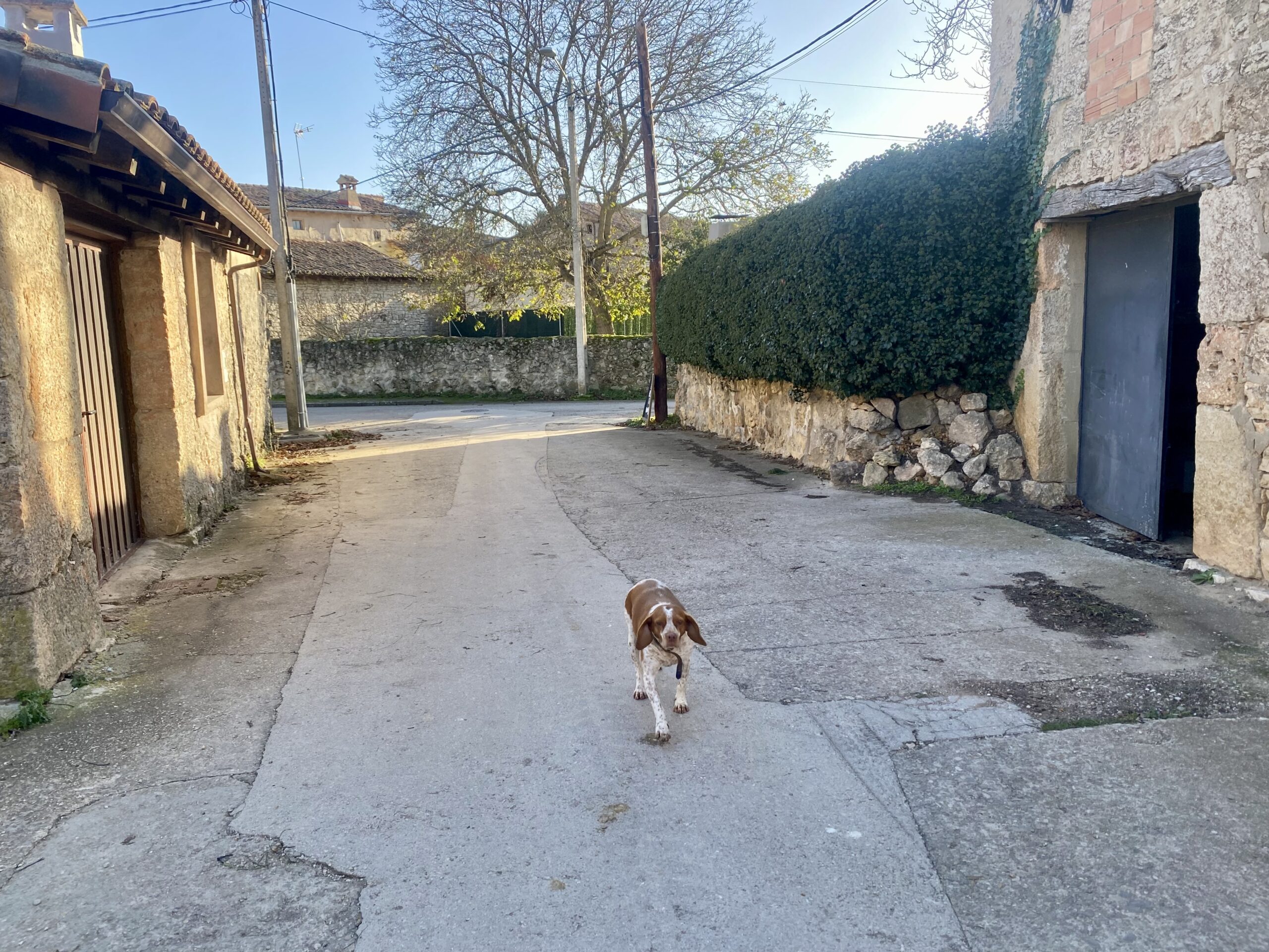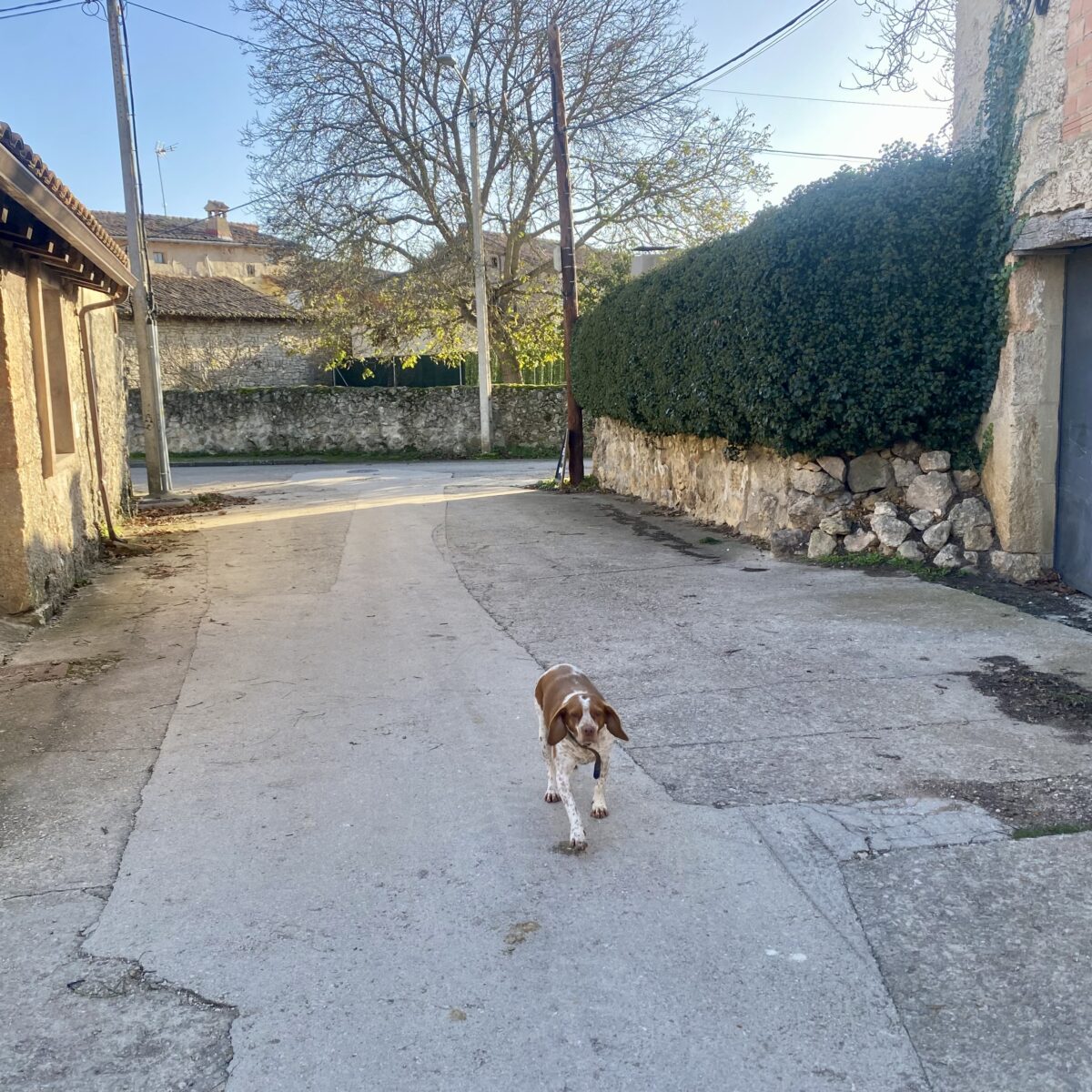 We stopped in the town of Zariquiegui to decompress. Several fellow pilgrims bought espressos. I have been avoiding coffee on this trip because sometimes it upsets my stomach. Strictly tea. The cafe owner had a cute little dog who didn’t like anyone, but especially not Aron!