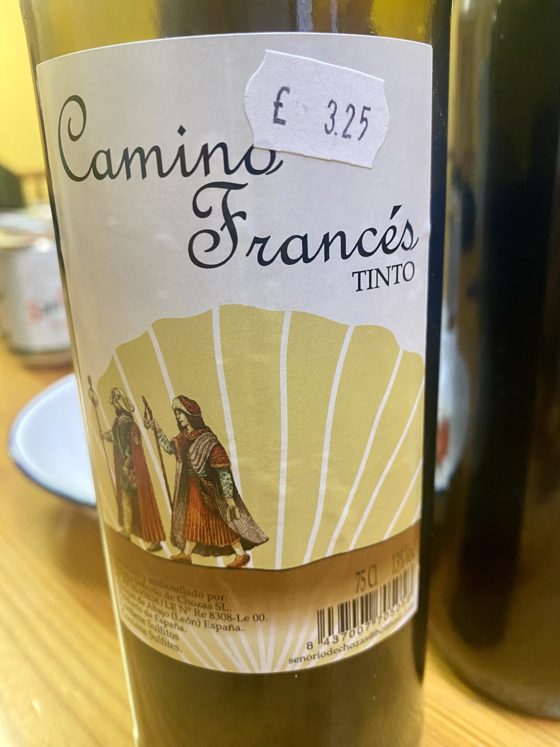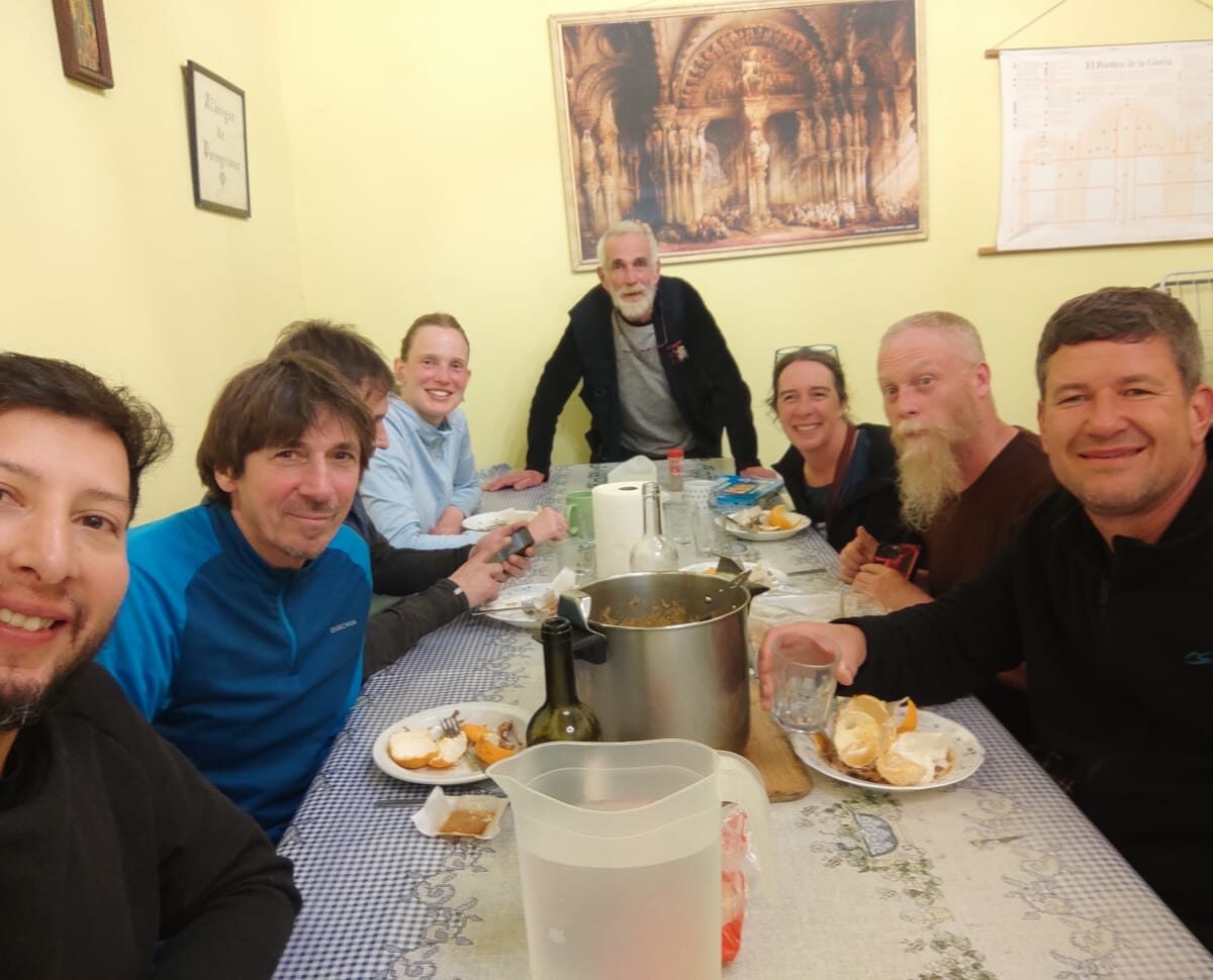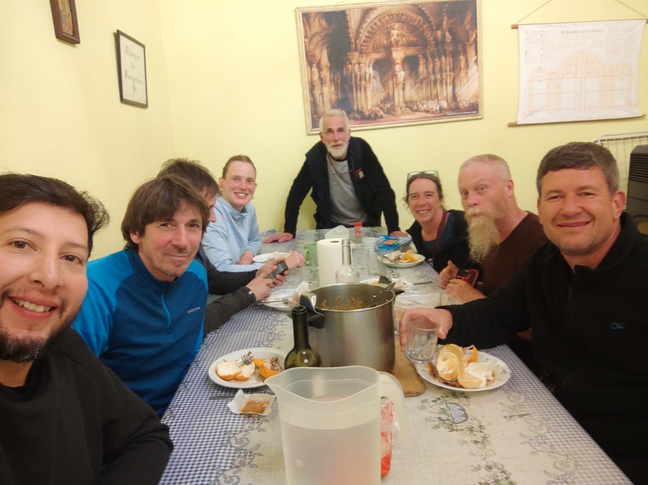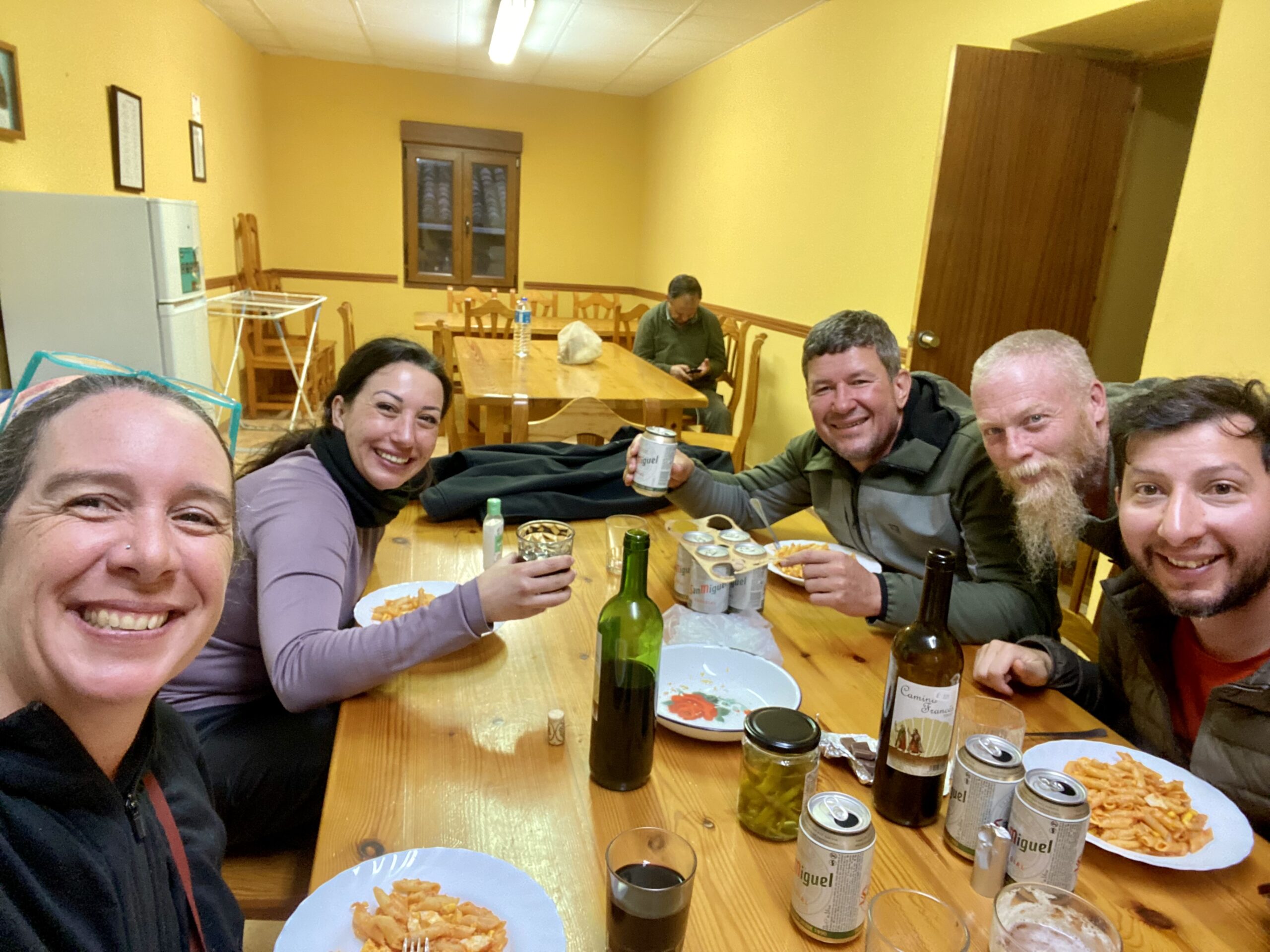 Just an hour and a half later, our friends arrived, and then it was a celebration. There was just one tiny grocery store around the corner. The proprietor would open it if you rang the bell. We bought pasta, microwave dinners, chocolate, bananas, and €3.25 bottles of wine. The albergue had the perfect kitchen space. We hung out from 4:30 to 8:30. By 9pm everyone was sound asleep. This is life on the Camino.