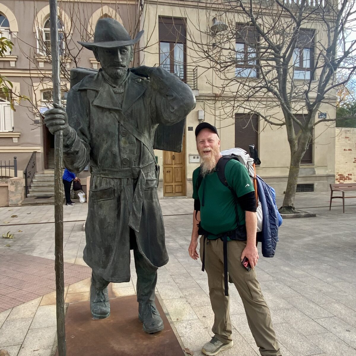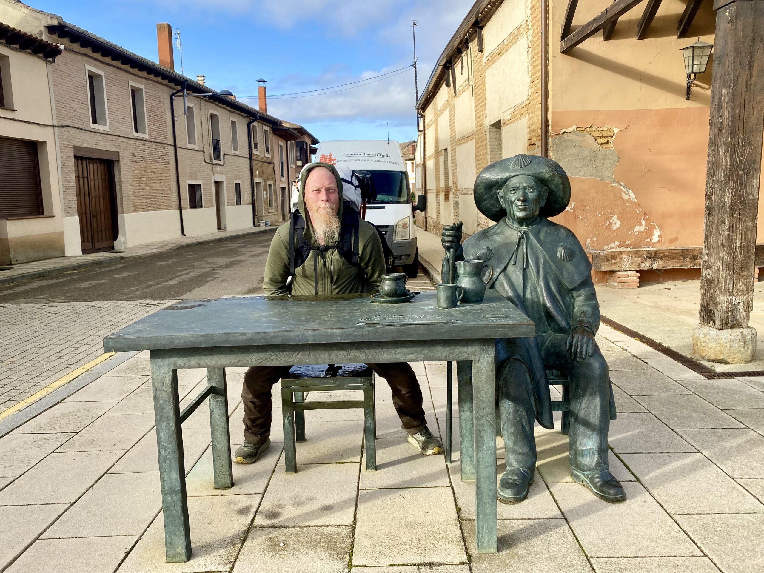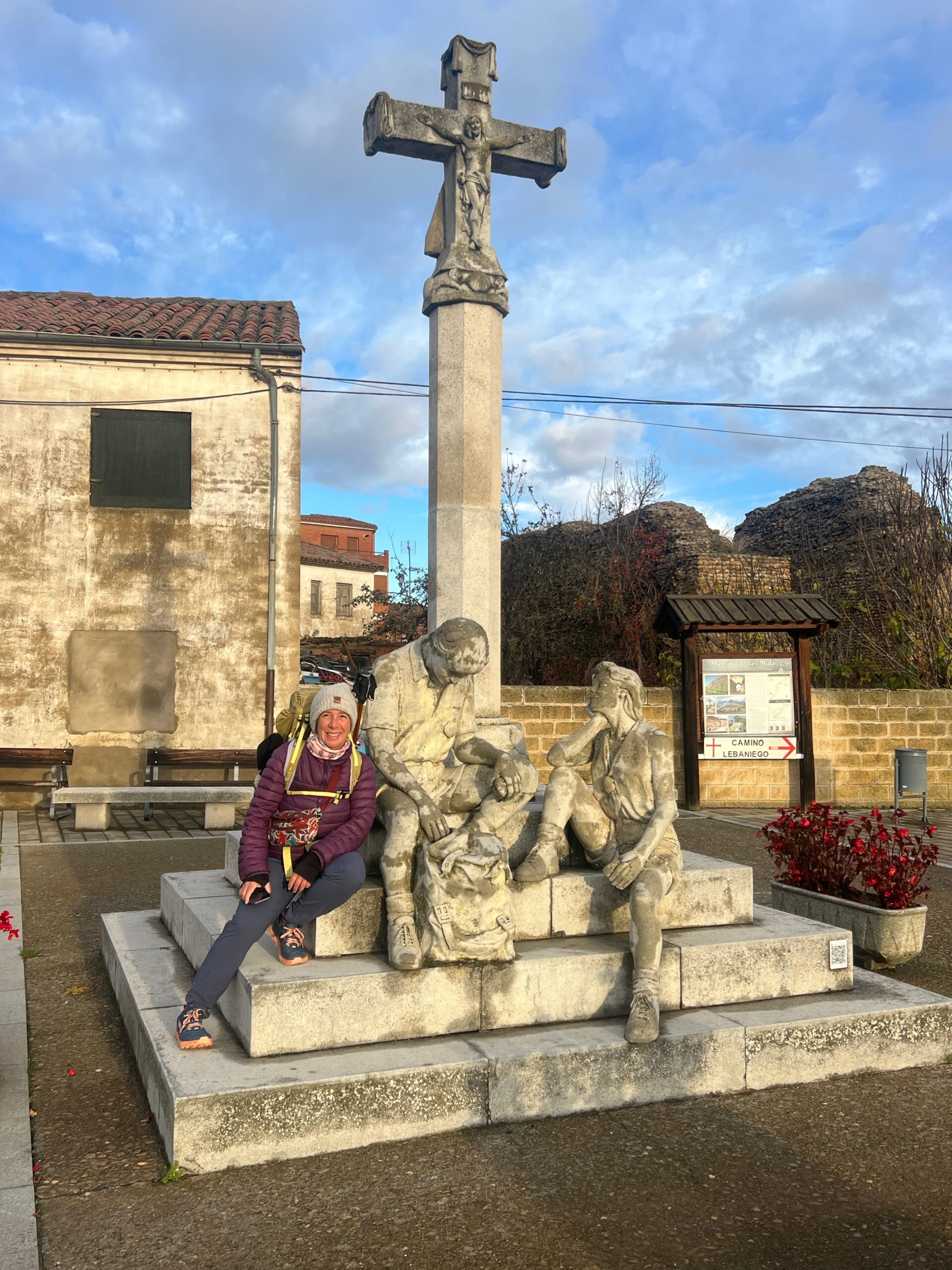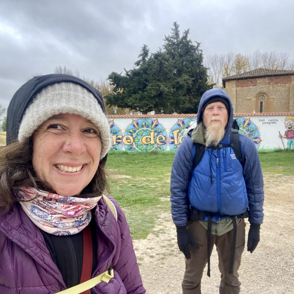 The landscape is amazing but it doesn’t offer much of a wind break. It’s interesting to wander through these small towns because everything is built up for the Camino and since this is the off-season everything is closed. We took our breaks wherever we could out of the wind. Behind a cathedral, in a small park, on the backside of a wall. We saw very few people. I keep thinking how peaceful it is. We only have to interact with people if we want to. A group of guys from Leon, France were celebrating Beaujolais Nuevo, or wine harvest. We offered to share some of our inferior Spanish wine with them, lol.