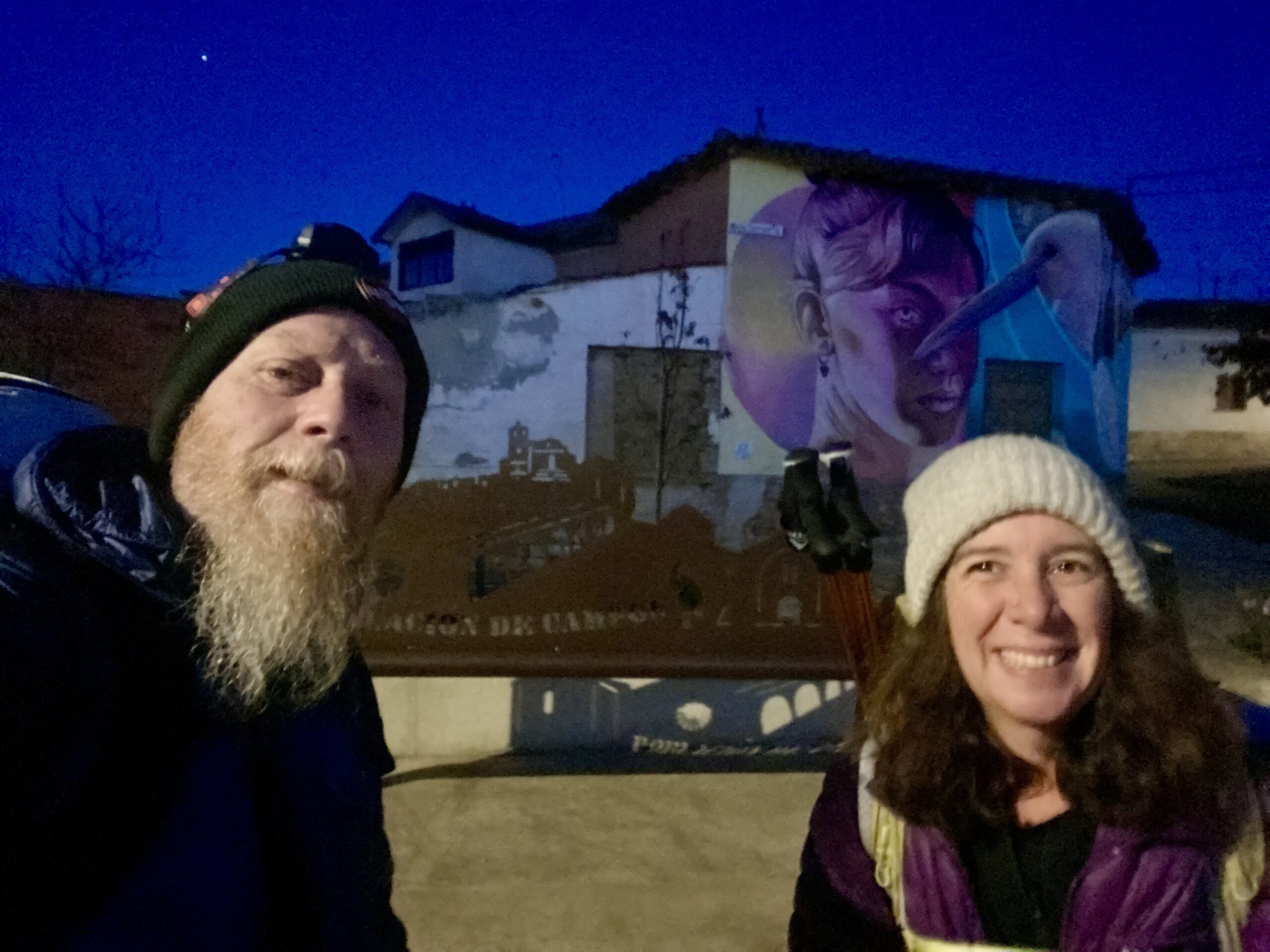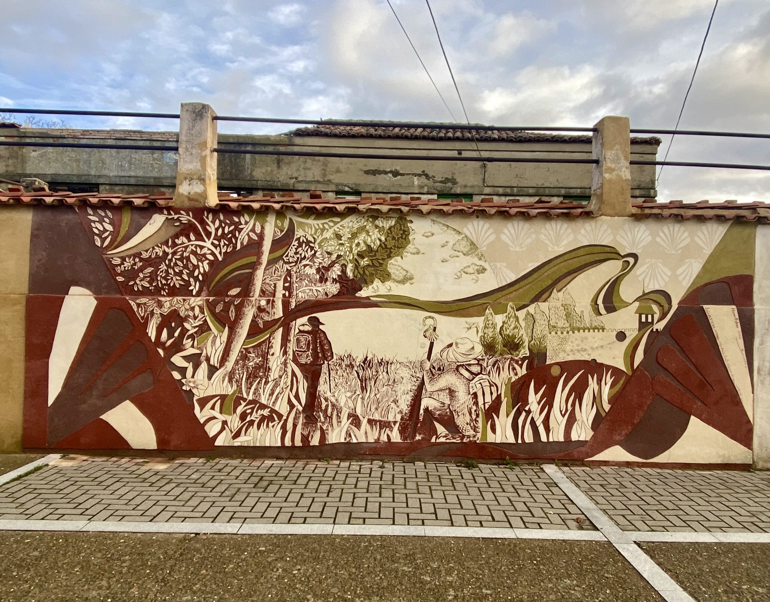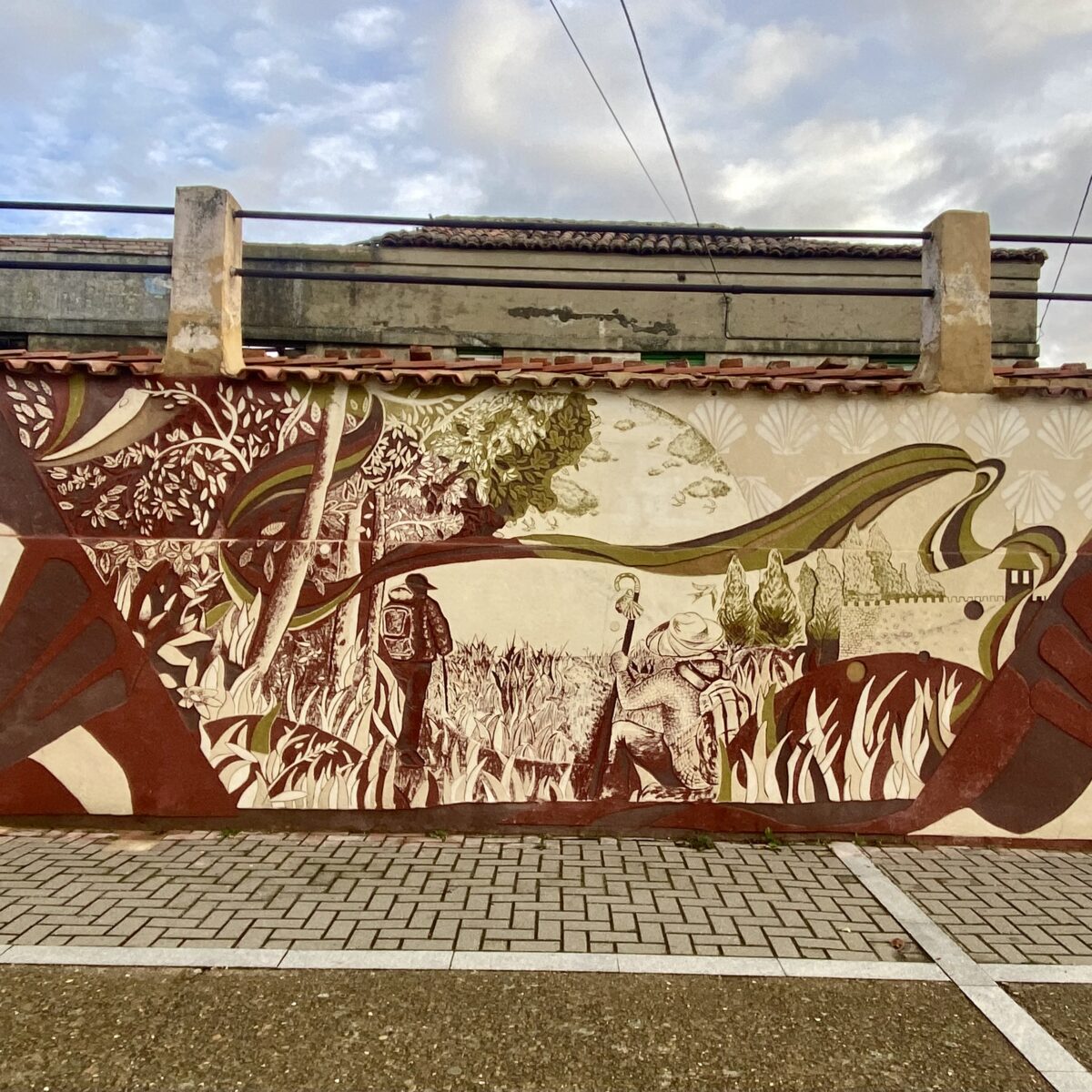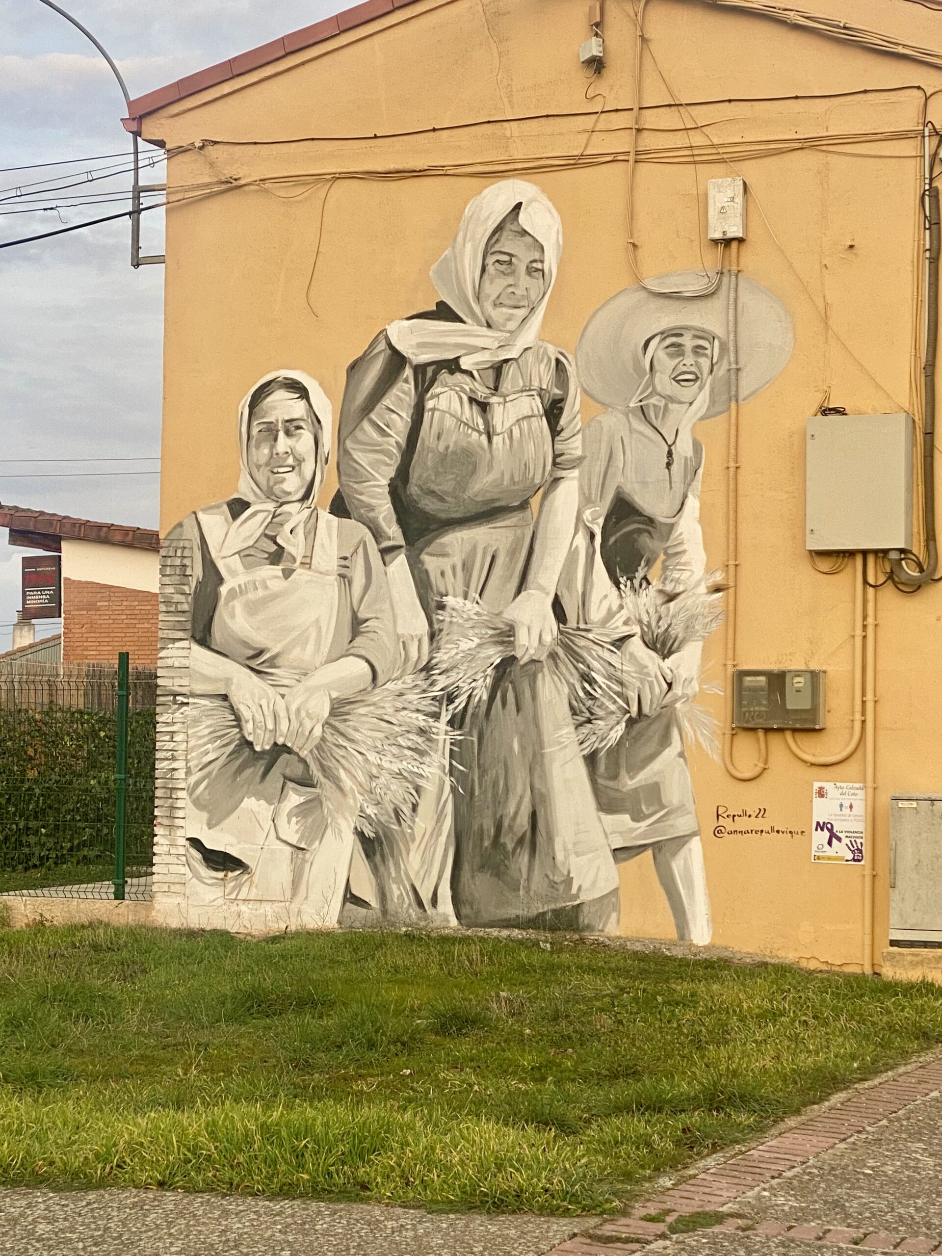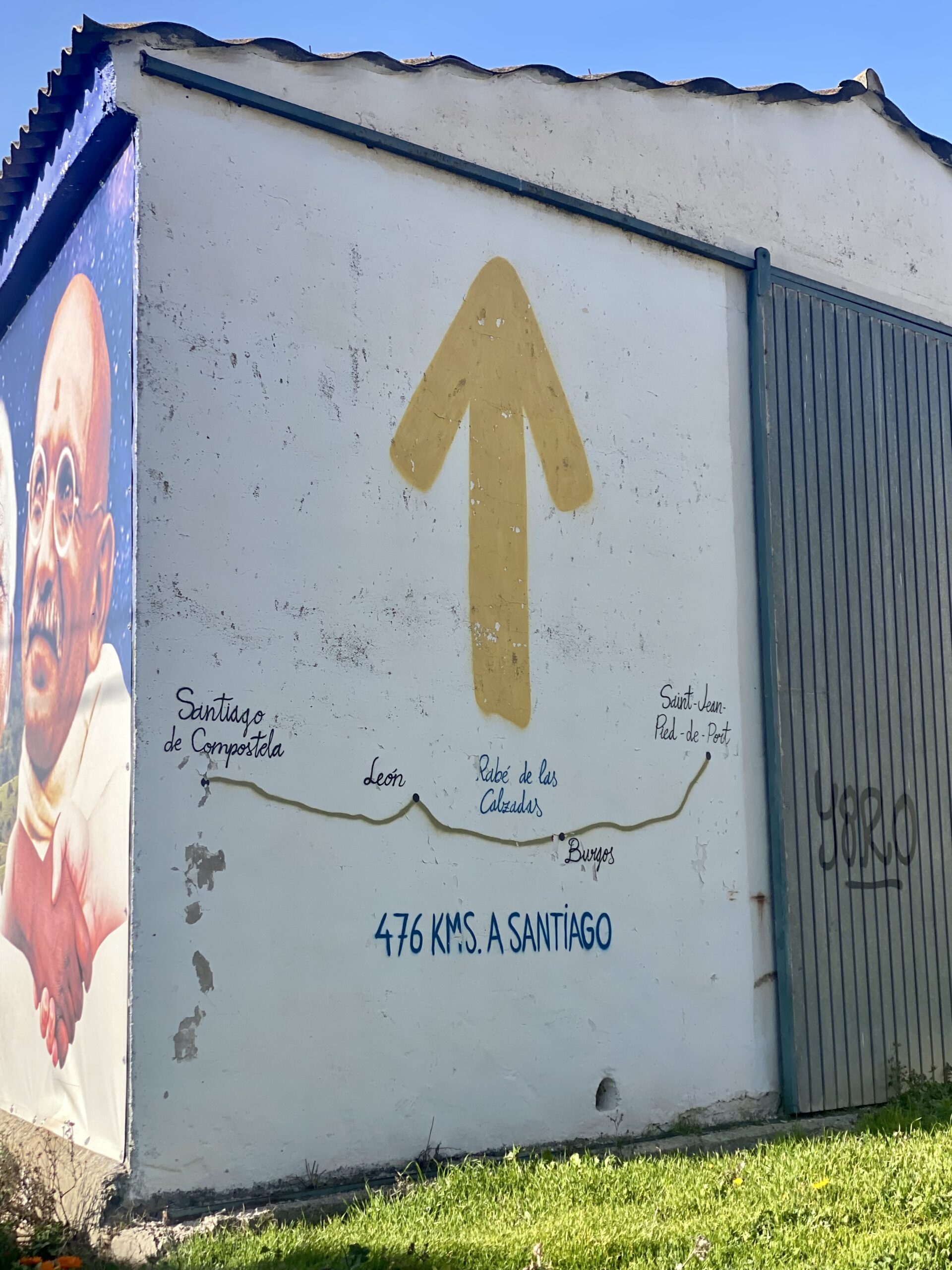 Afterwards we celebrated with a delicious seafood lunch in the Plaza Mayor (only €27 for pasta with clams & shrimp, squid rice pilaf, bread, dessert and all beverages for 2 people). We wandered the streets of Sahagun admiring the old churches and the colorful street art. At last we decided it was time to walk our final 5km of the day to the next town, Calzada del Coto. There was a very highly rated donativo albergue there (by donation). We ran into Tatiana and Felipe on our way out of town, who were climbing the hill to get their own halfway certificates.