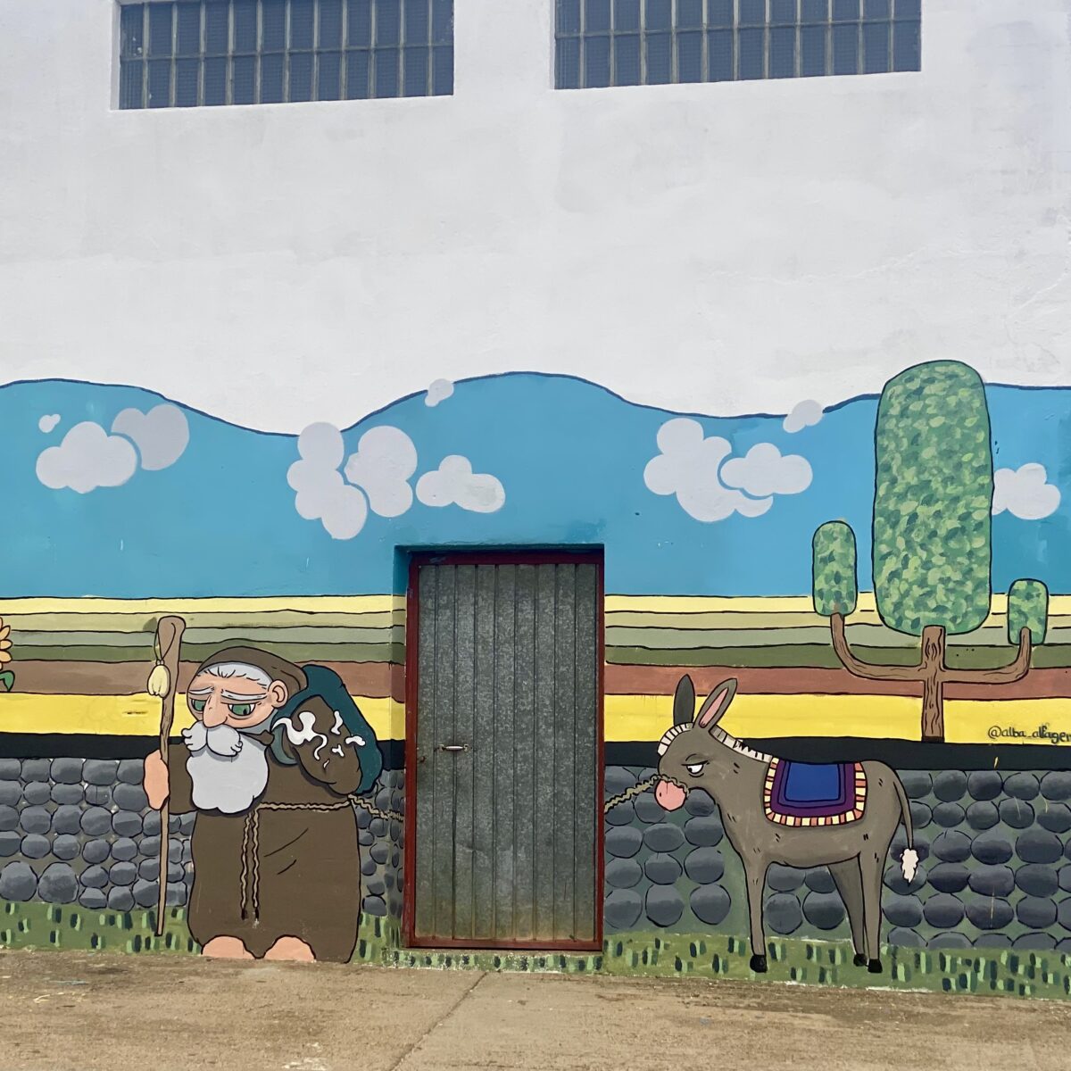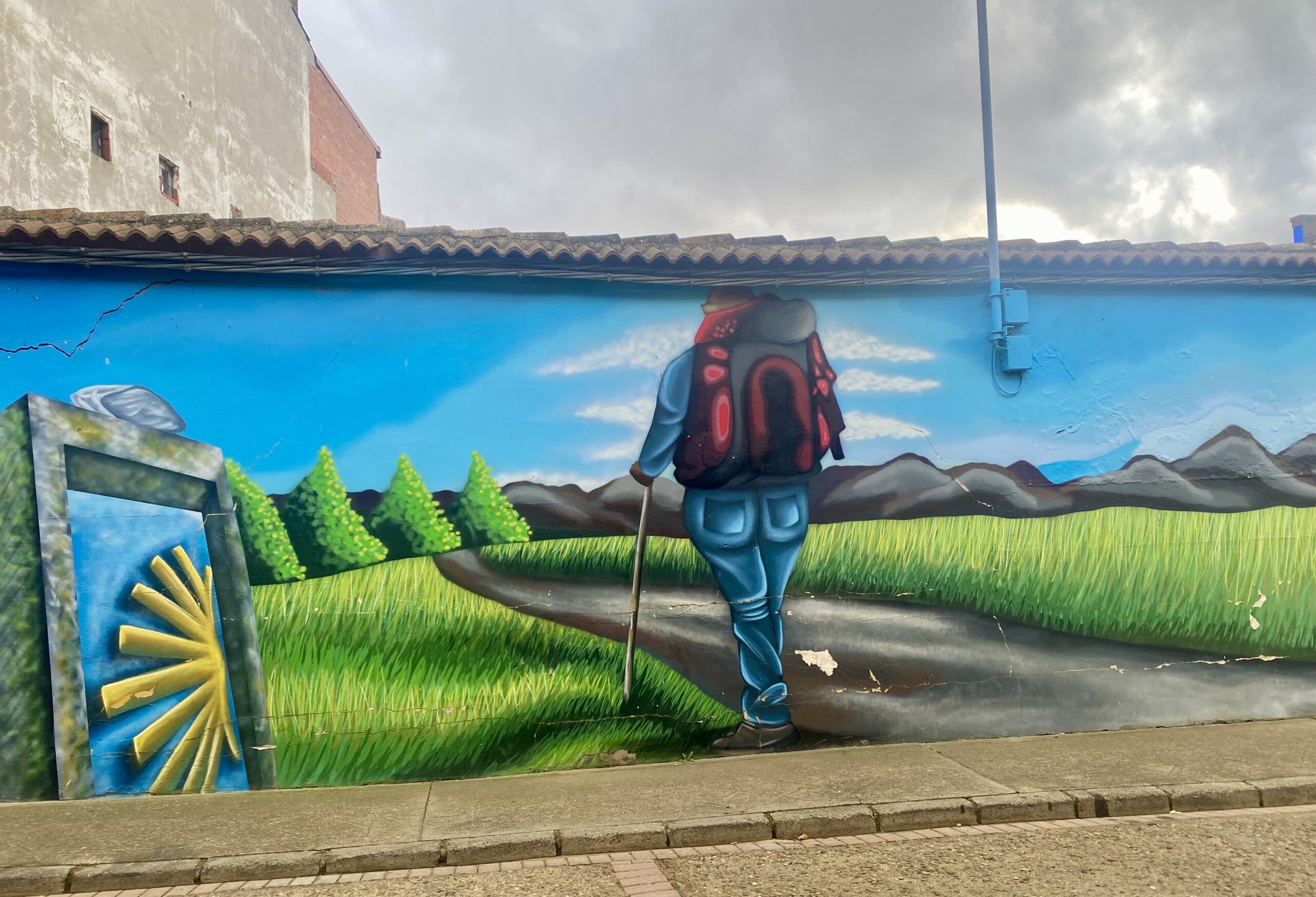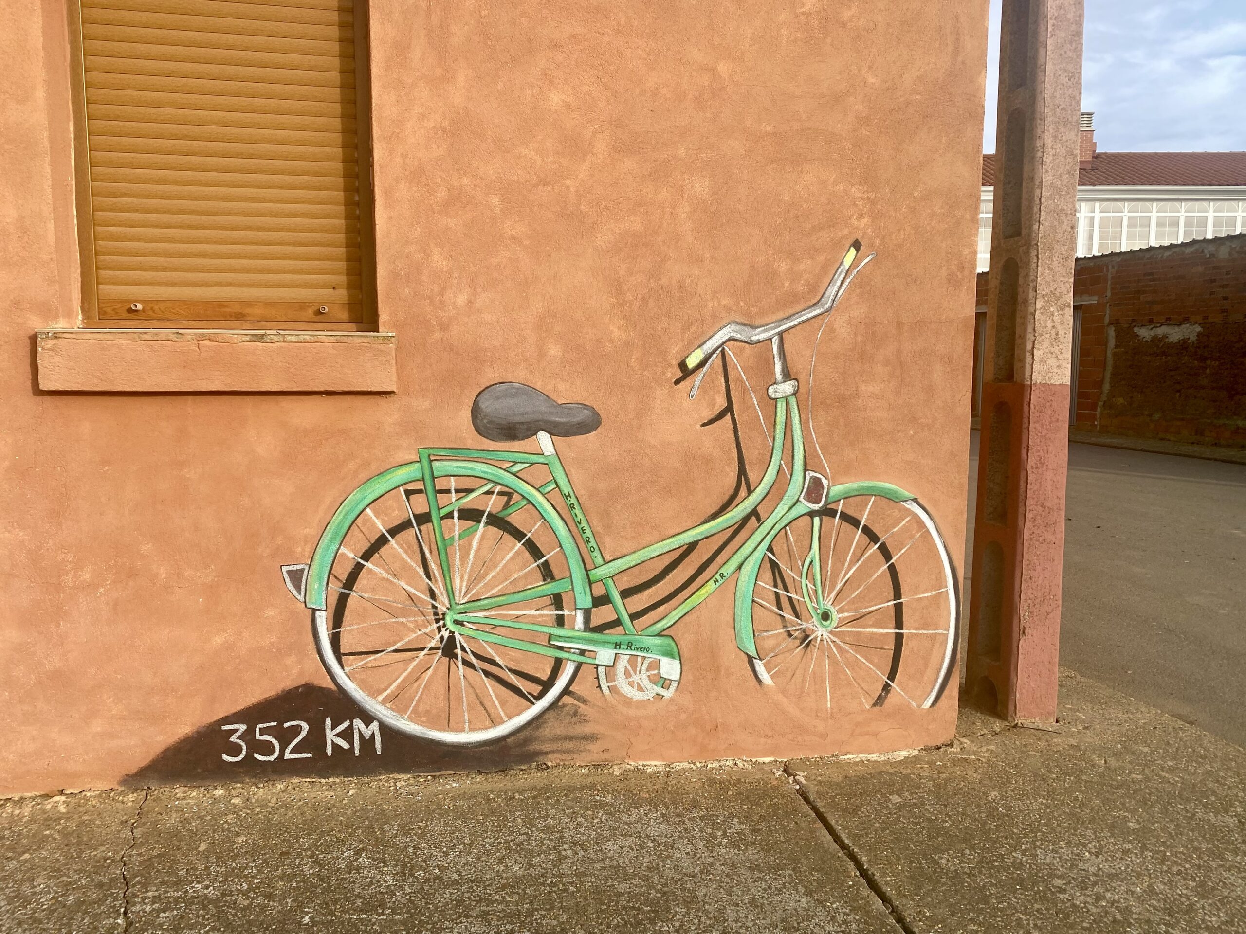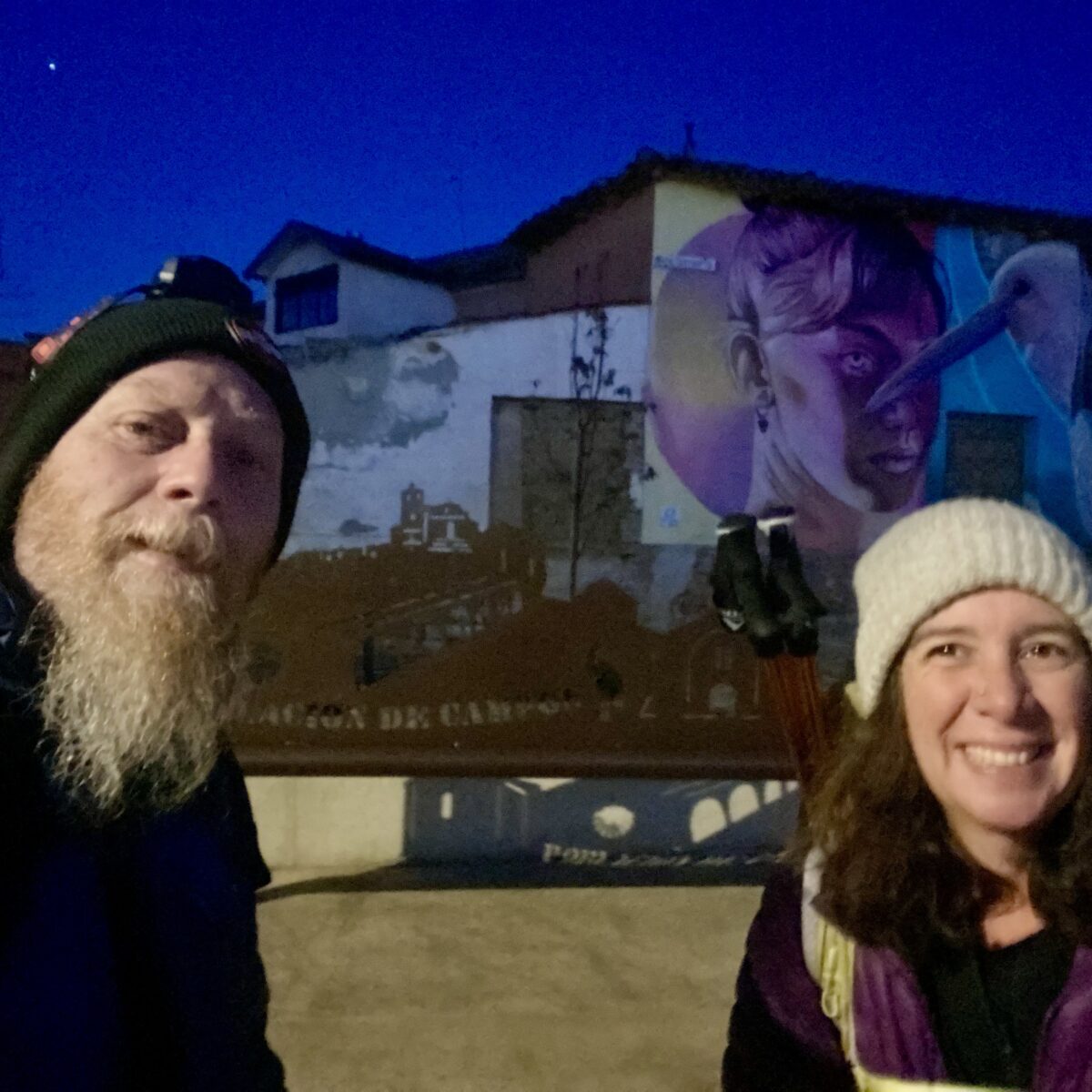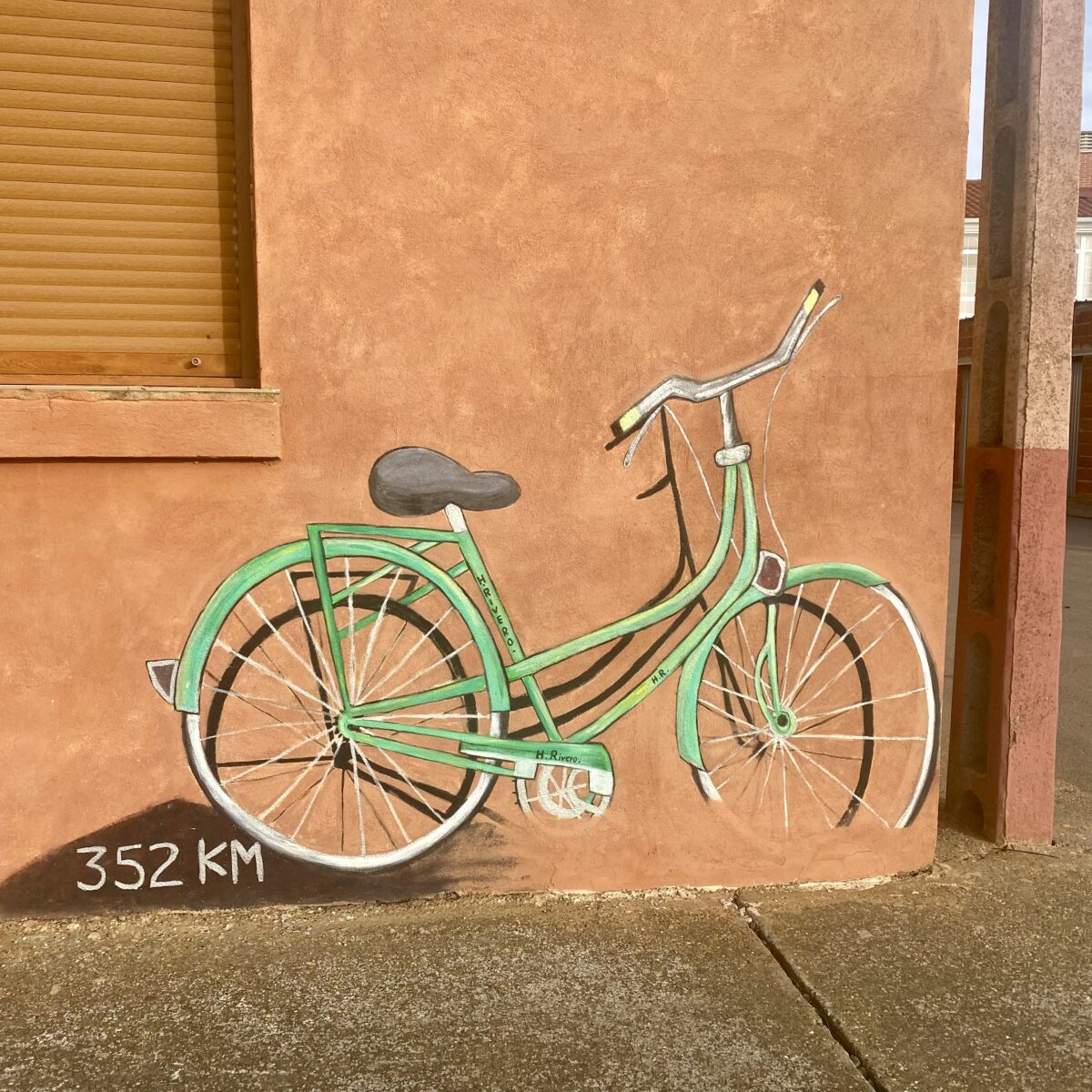 Afterwards we celebrated with a delicious seafood lunch in the Plaza Mayor (only €27 for pasta with clams & shrimp, squid rice pilaf, bread, dessert and all beverages for 2 people). We wandered the streets of Sahagun admiring the old churches and the colorful street art. At last we decided it was time to walk our final 5km of the day to the next town, Calzada del Coto. There was a very highly rated donativo albergue there (by donation). We ran into Tatiana and Felipe on our way out of town, who were climbing the hill to get their own halfway certificates.