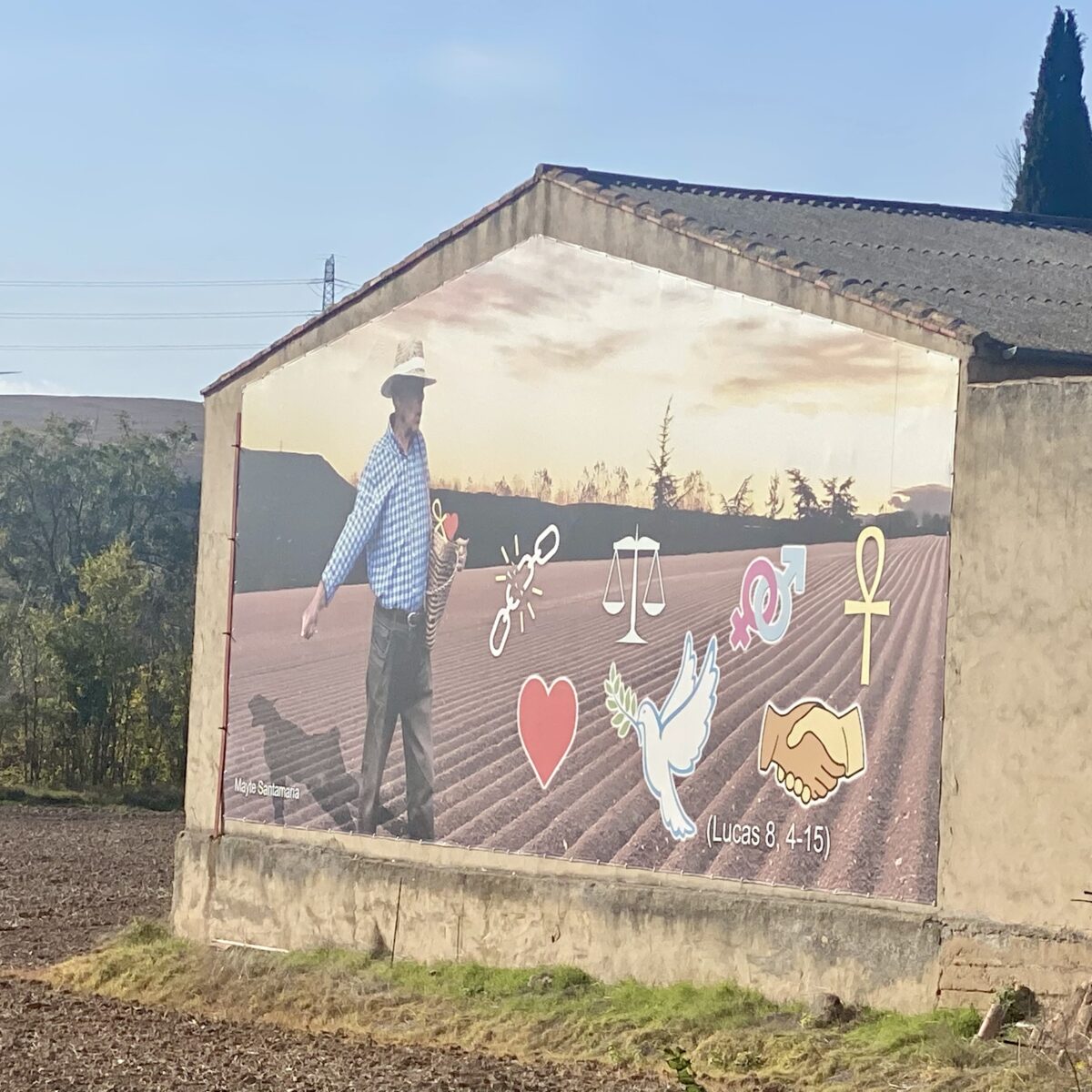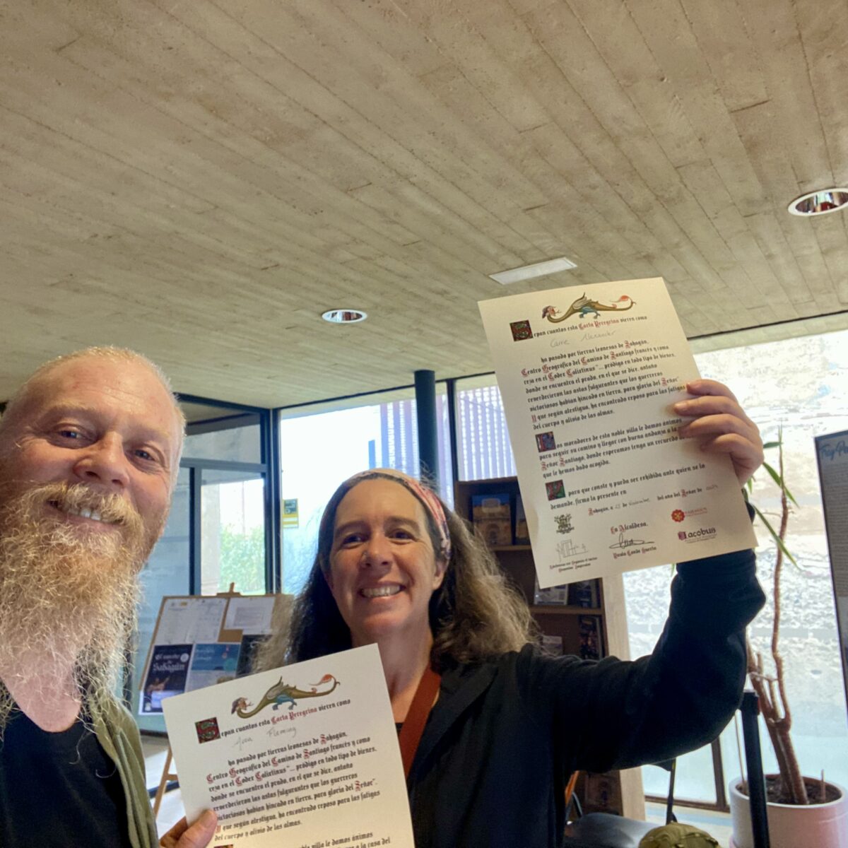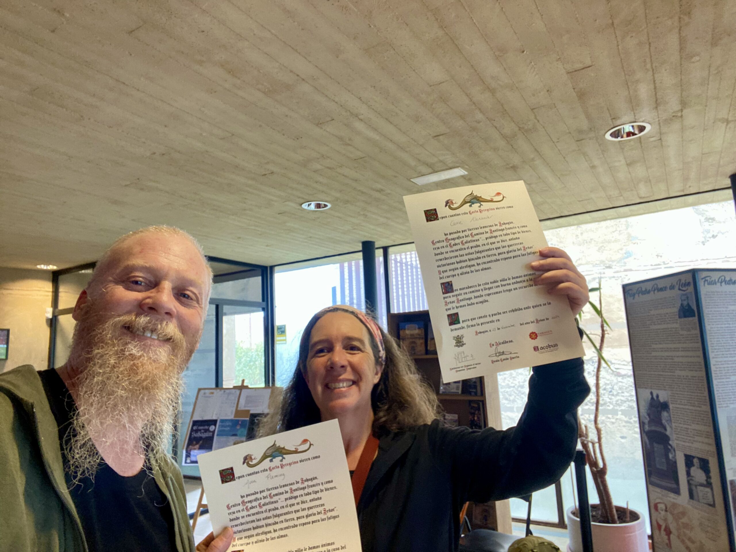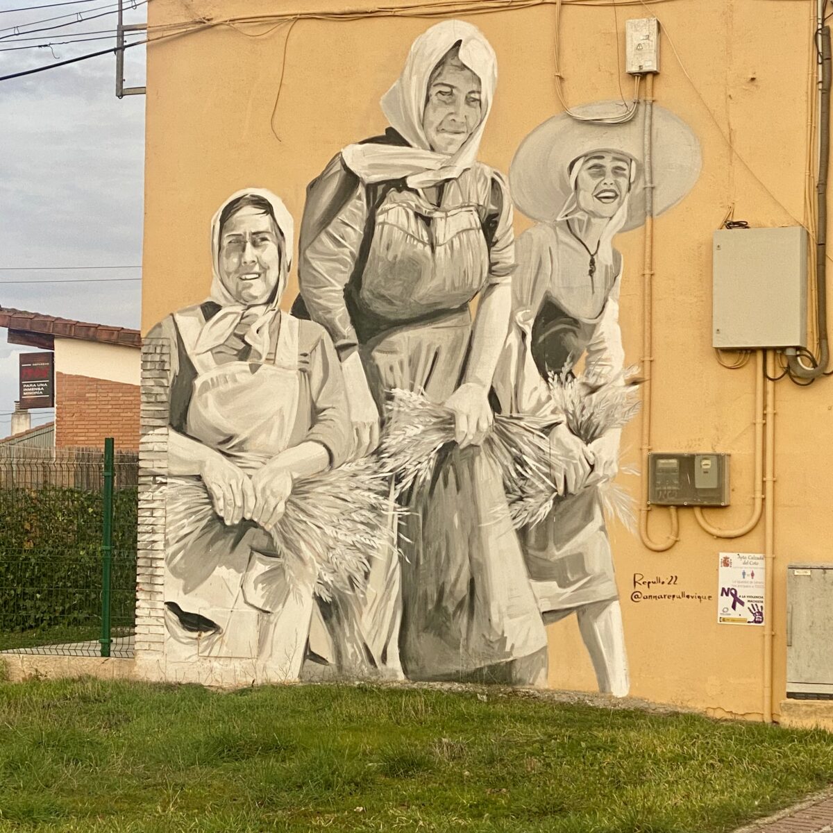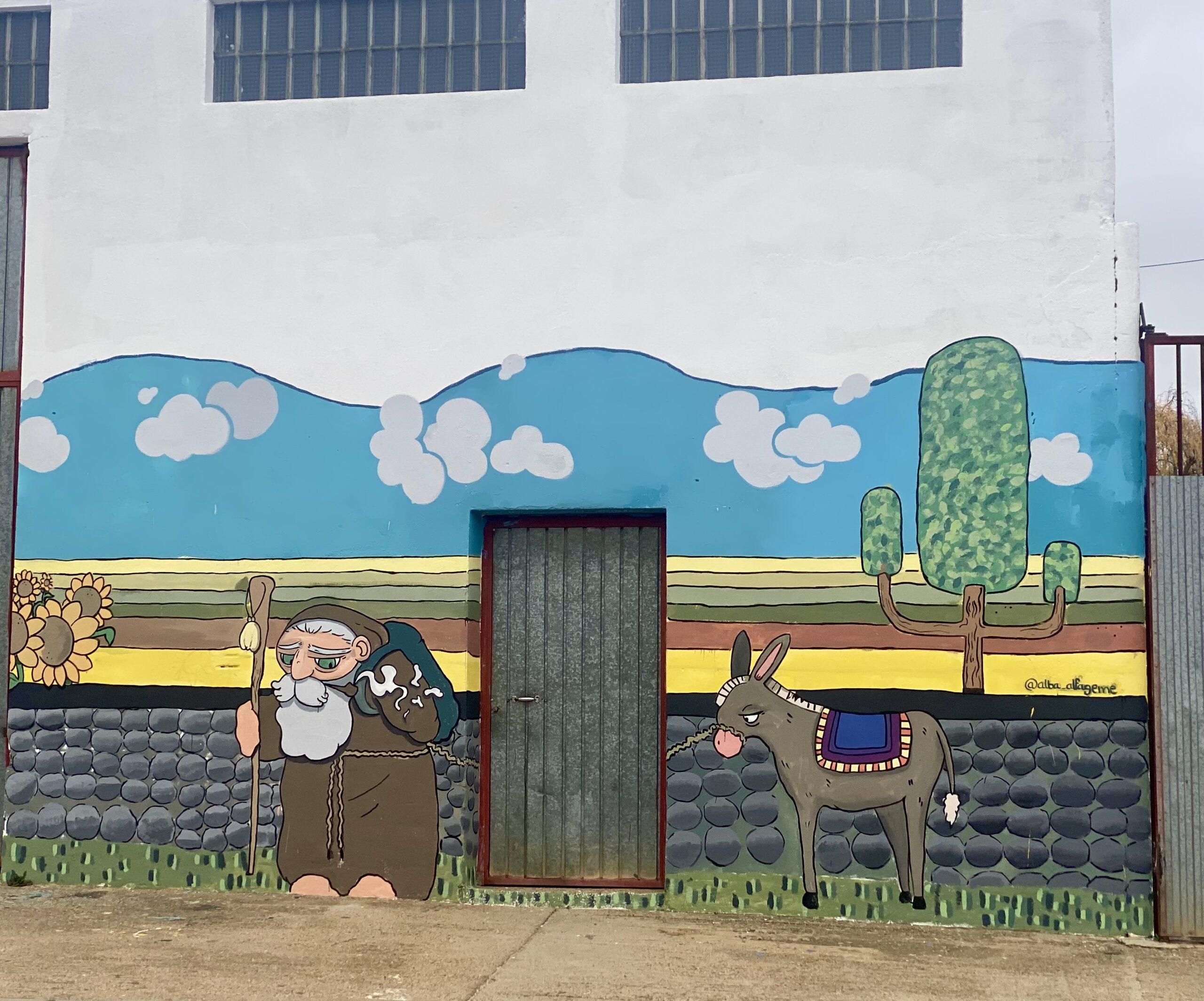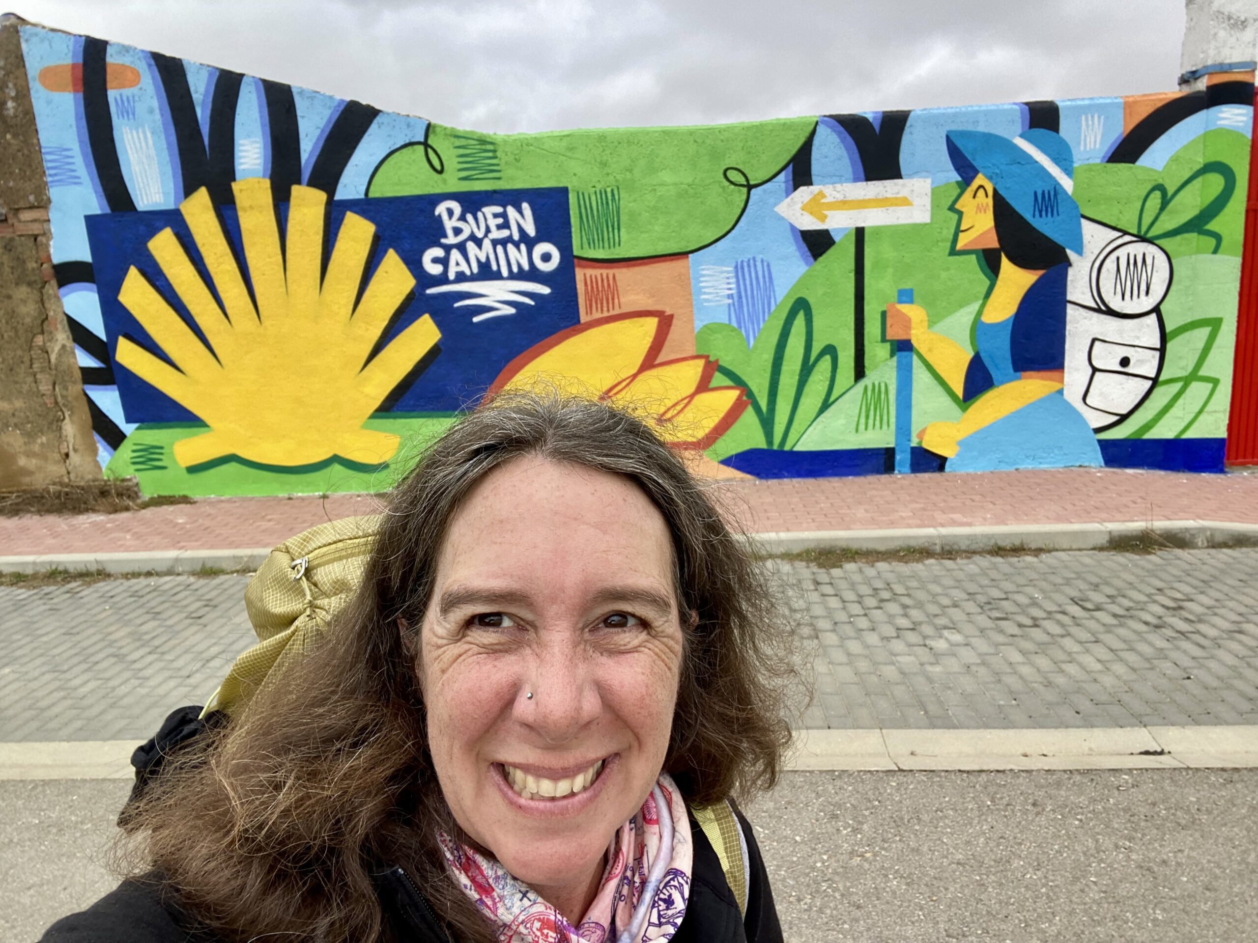 Afterwards we celebrated with a delicious seafood lunch in the Plaza Mayor (only €27 for pasta with clams & shrimp, squid rice pilaf, bread, dessert and all beverages for 2 people). We wandered the streets of Sahagun admiring the old churches and the colorful street art. At last we decided it was time to walk our final 5km of the day to the next town, Calzada del Coto. There was a very highly rated donativo albergue there (by donation). We ran into Tatiana and Felipe on our way out of town, who were climbing the hill to get their own halfway certificates.