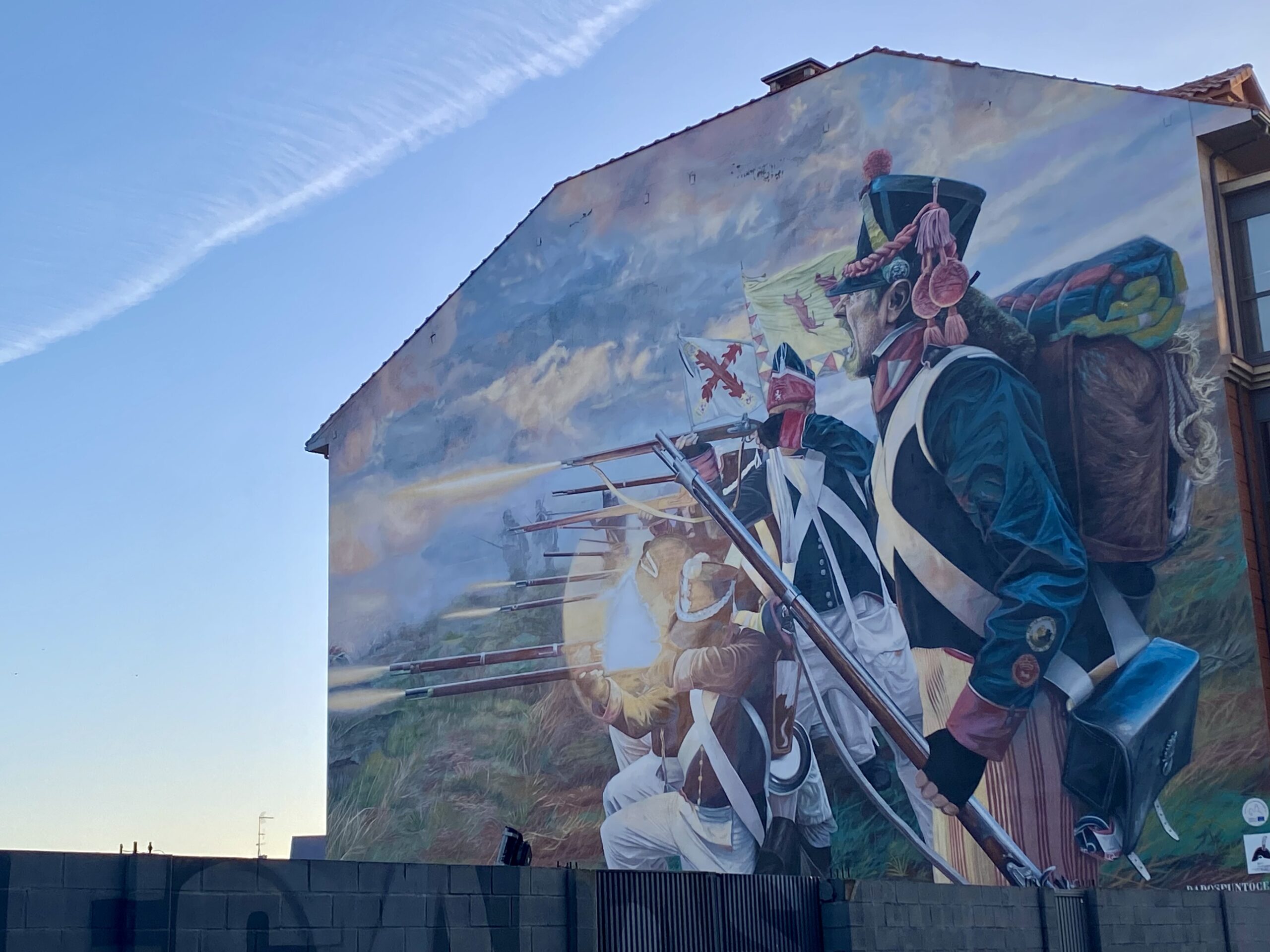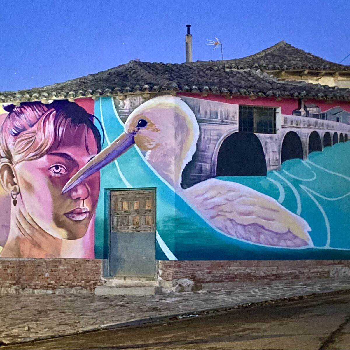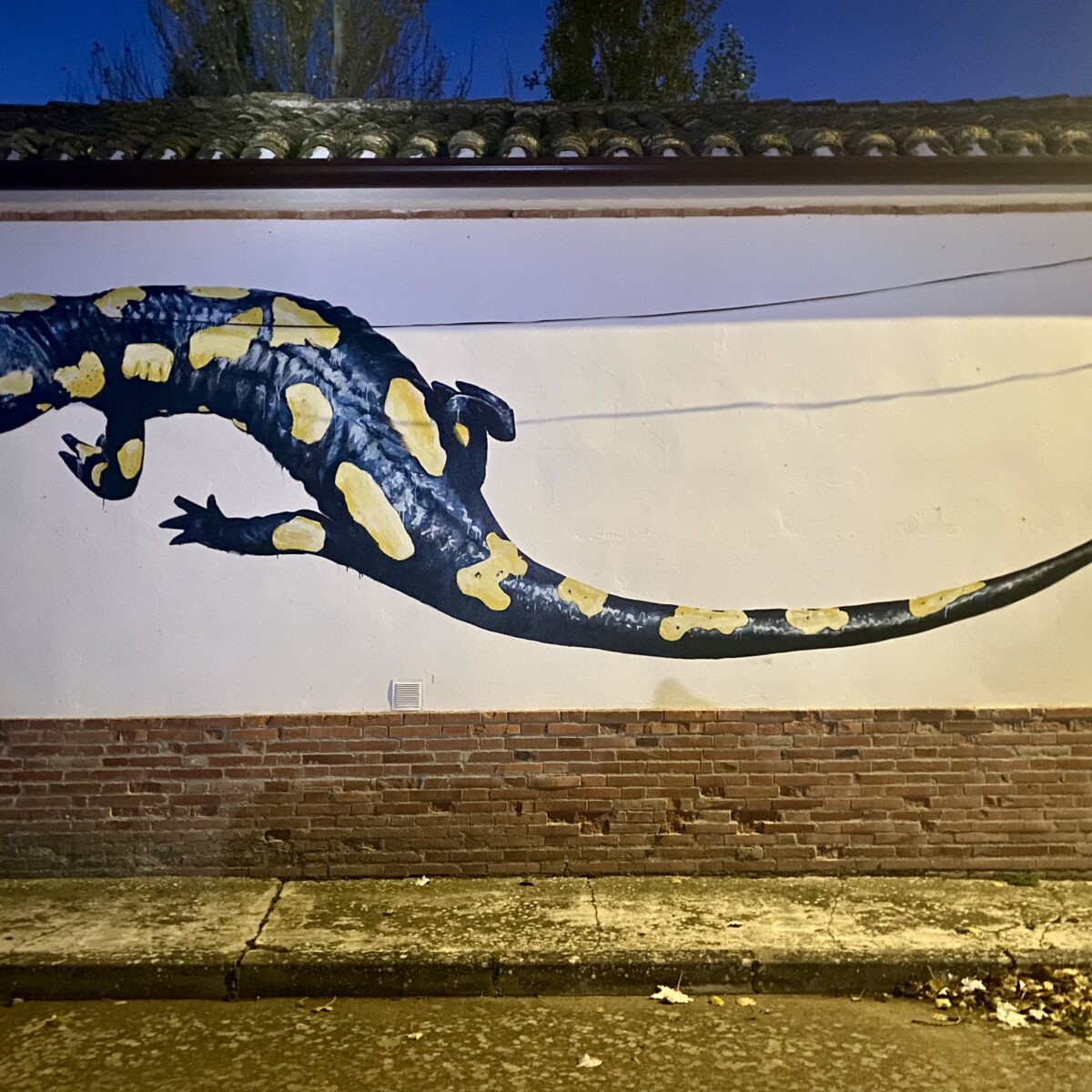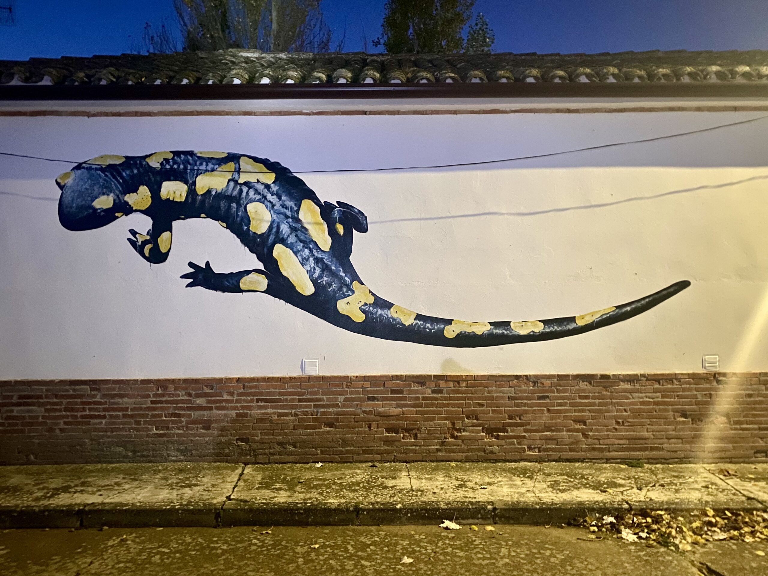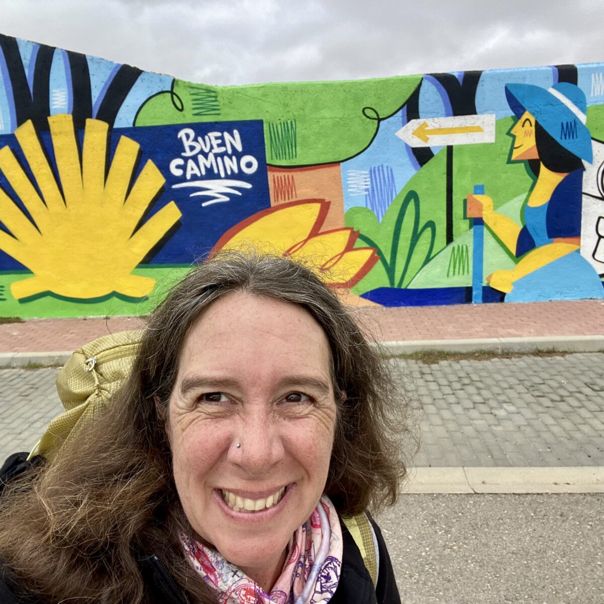 Afterwards we celebrated with a delicious seafood lunch in the Plaza Mayor (only €27 for pasta with clams & shrimp, squid rice pilaf, bread, dessert and all beverages for 2 people). We wandered the streets of Sahagun admiring the old churches and the colorful street art. At last we decided it was time to walk our final 5km of the day to the next town, Calzada del Coto. There was a very highly rated donativo albergue there (by donation). We ran into Tatiana and Felipe on our way out of town, who were climbing the hill to get their own halfway certificates.