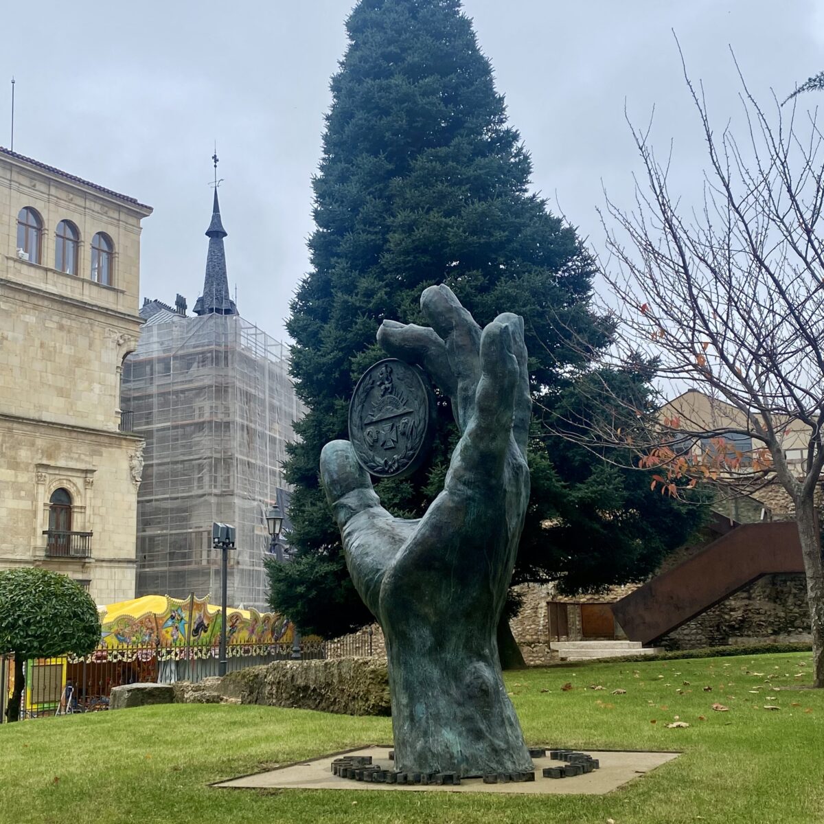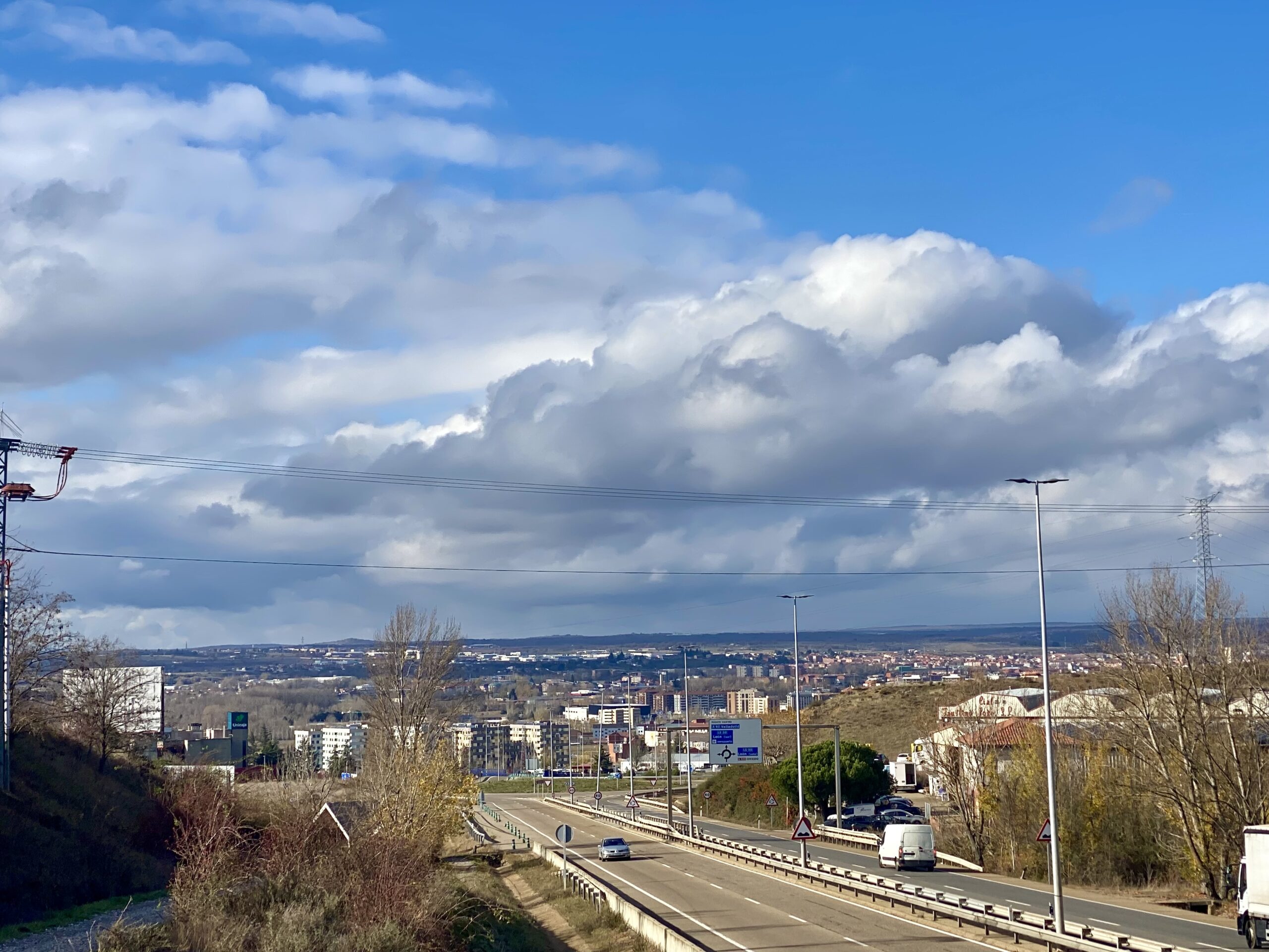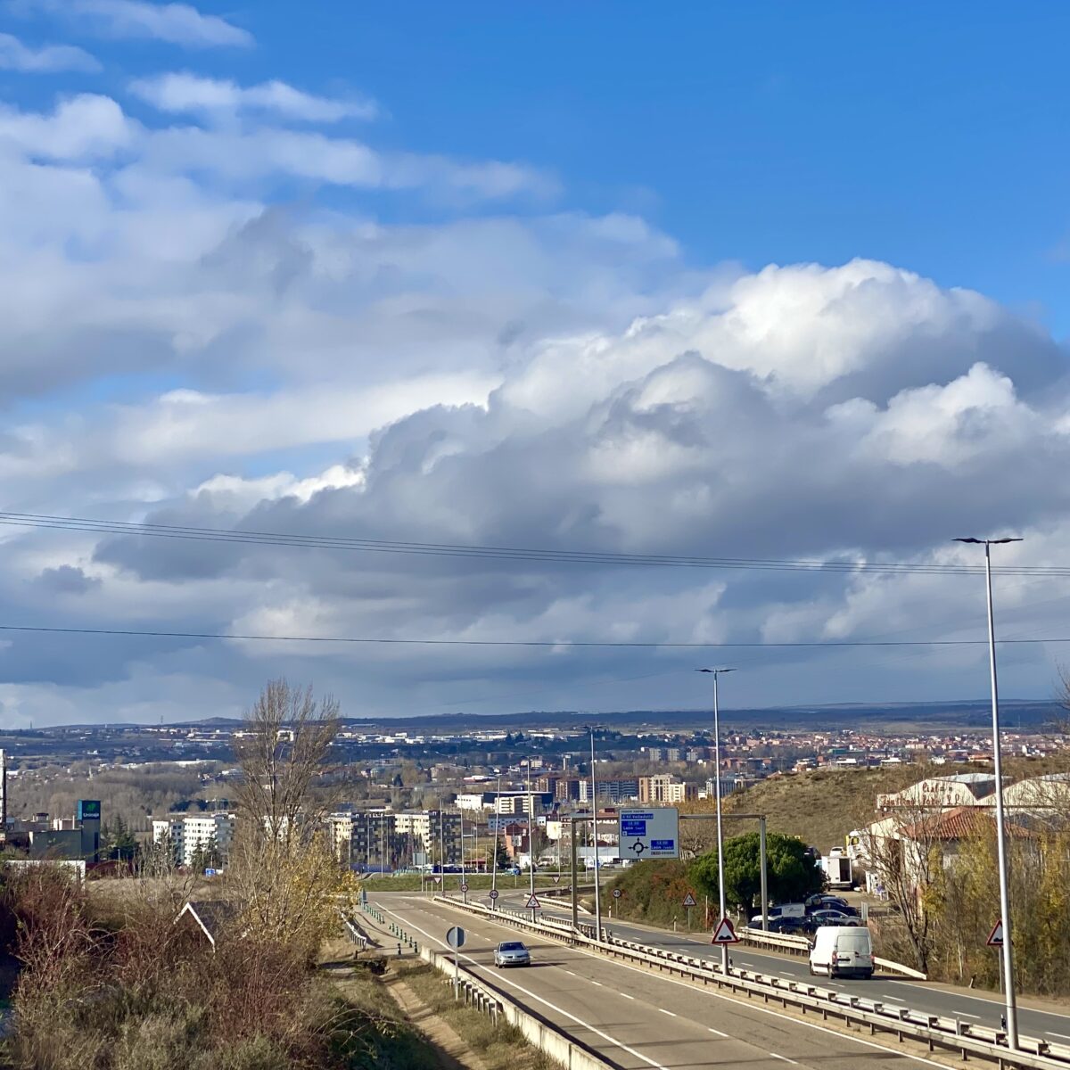 It was supposed to rain all morning, so we were prepping for that, but by the time we were up and moving the rain had finished. So the worst thing we had to deal with were a couple of mud puddles. By 10am we were enjoying a brilliant blue sky and sunshine. Only the wind was cold, but it encouraged us to pick up our pace into the city of Leon.