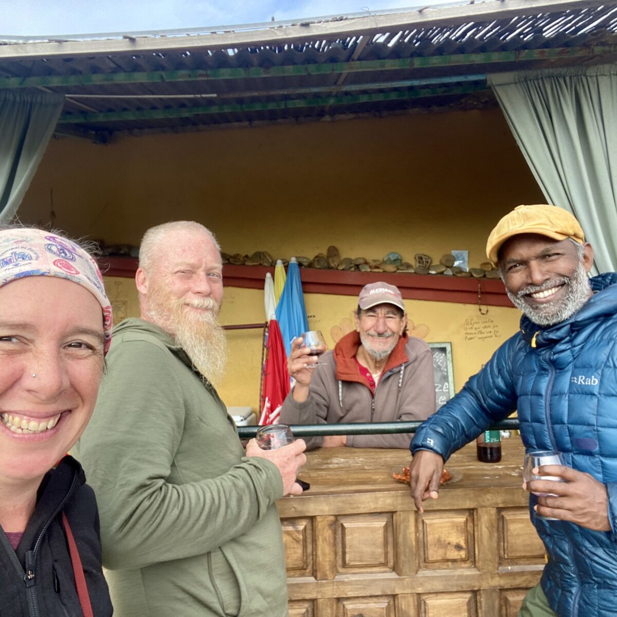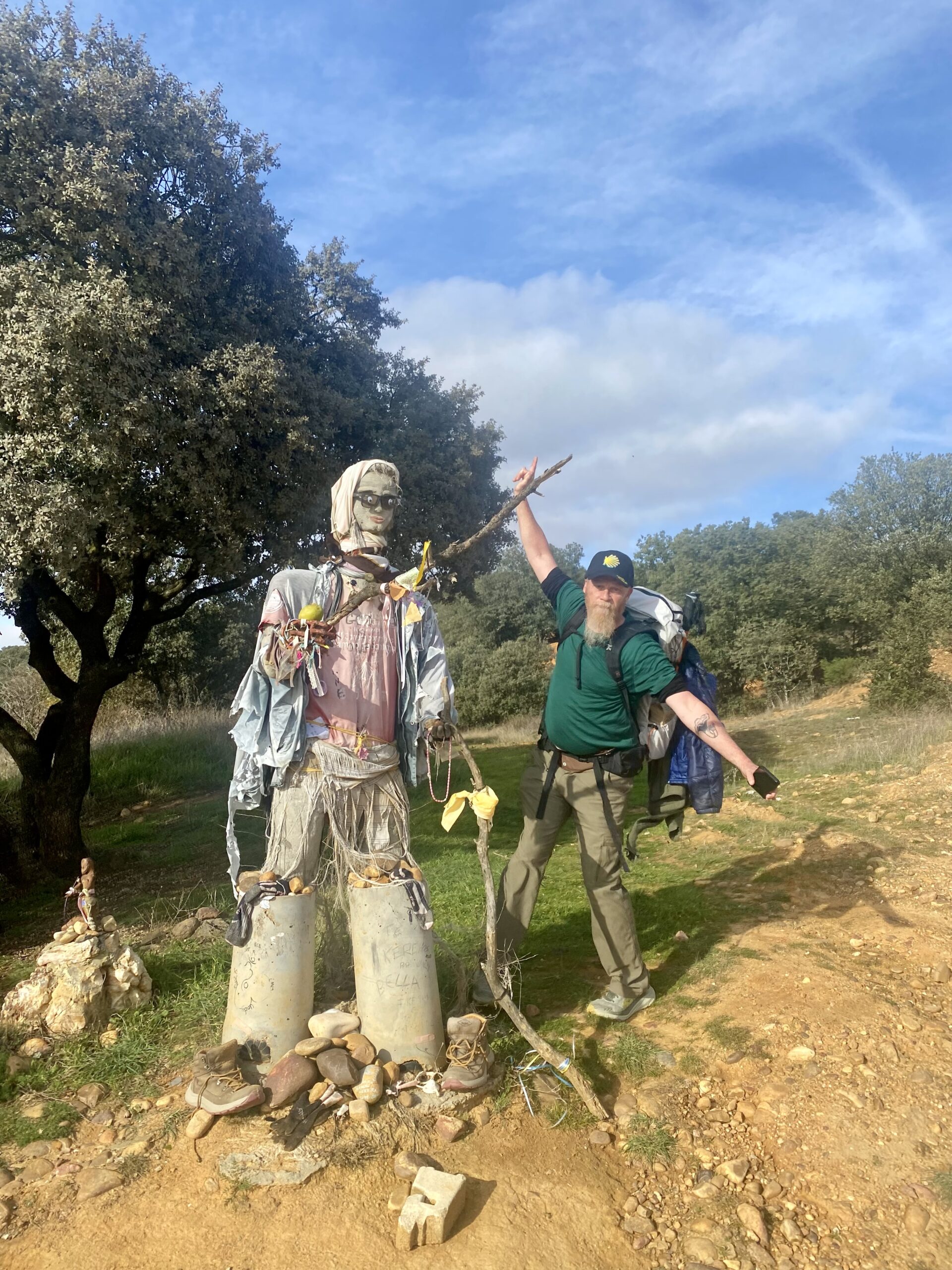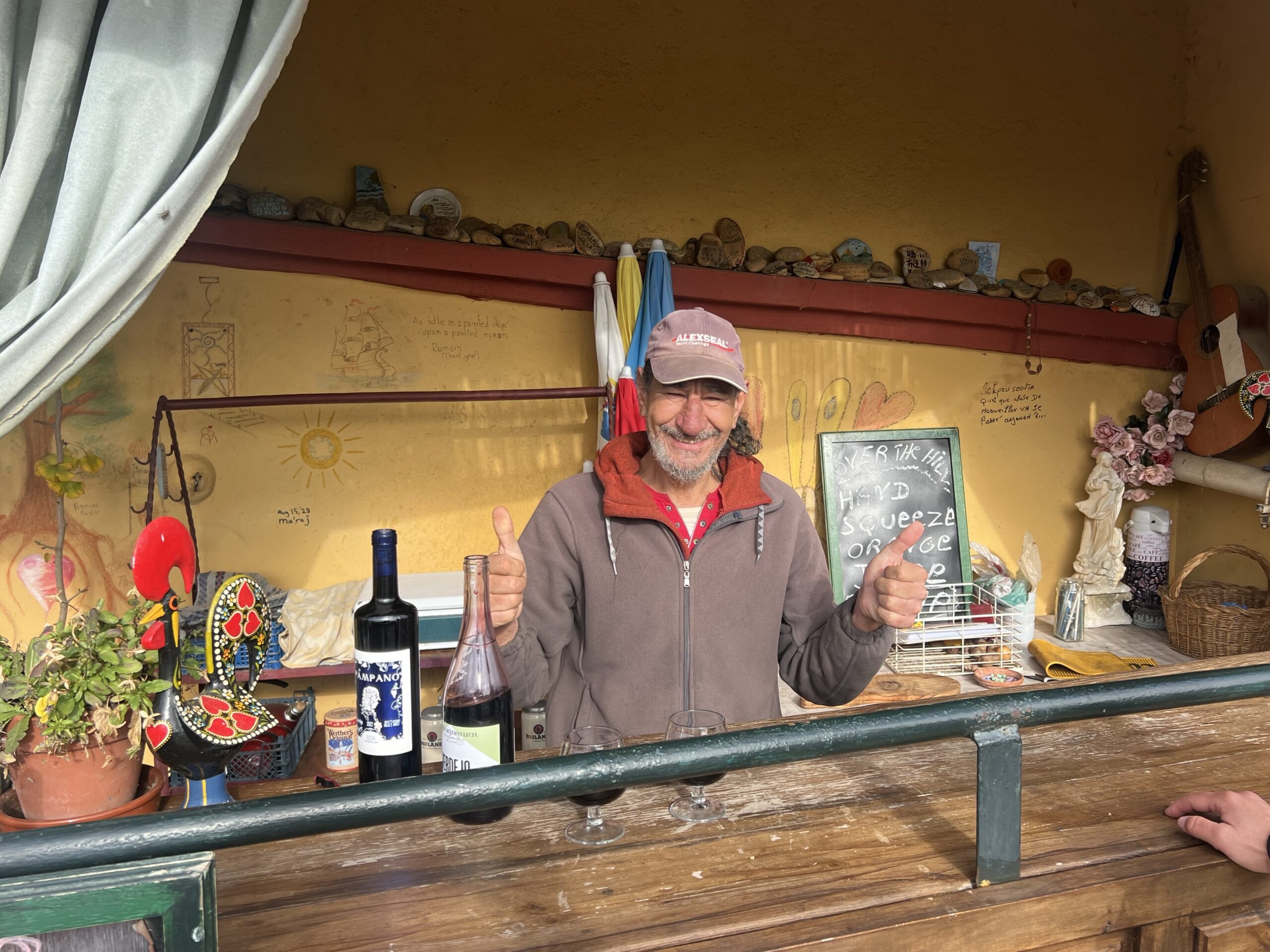 Our best stop of the day was about halfway to Astorga. Just as we crested our first big hill we saw a little stand that said “wine tasting, by donation”. It was only 11:30am but I knew Aron was going to stop. Two hours later we were still there, drinking wine, chatting with Josss the proprietor, adoring his dog Goodji, and welcoming any pilgrim that happened by to join us. At one point Josss brought out his harmonica and the dog sang along. Later he brought out a stereo speaker, and Aron introduced everyone to Dope Lemon. Among the pilgrims who joined us: Alvin from India, a man from Hungary, and Pablo from Madrid who had walked the entire Camino and was now walking back the other way all the way home!